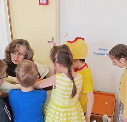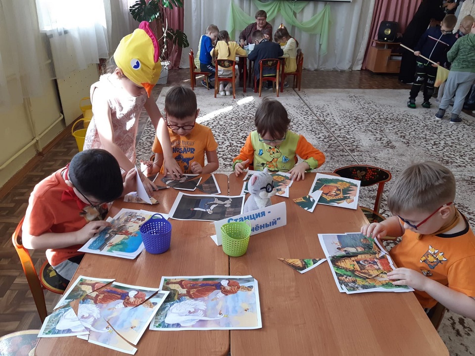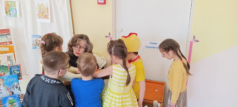 Учитель-дефектолог Елена Валерьевна Короленко в образе Кота учёного из пушкинского Лукоморья весело и задорно руководила всеми этапами квест-игры, начавшейся с танцевальной минутки и примерки самого настоящего цилиндра из 19 века. Четыре команды из детей старшей и подготовительной группы по маршрутным листам посетили игровые станции «Волшебный сундучок», «Золотая рыбка», «Царевна Лебедь» и «Кот учёный», где выполняли различные задания: собирали пазлы по сказкам поэта, раскрашивали с повязкой на глазах рельефные рисунки сказочных героев на специальной термобумаге, разбирались с предметами волшебного сундучка и даже успели послушать отрывок из сказки о рыбаке и рыбке и ответить на вопросы по ней. За успешно выполненное задание на каждой станции команды получали по «изумрудному» камешку, которые потом обменяли на сладкие гостинцы.