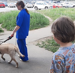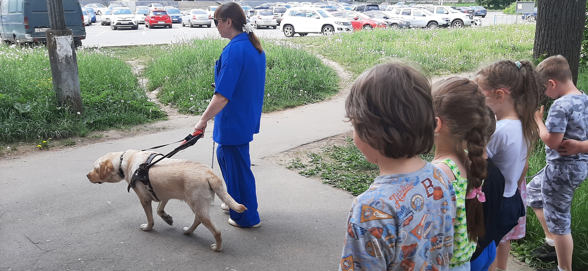 Дети ознакомились со специальной литературой для детей с нарушениями зрения, узнали о системе грамотности для слепых и её создателе Луи Брайле, поработали с тифлопособиями. Светлана Александровна рассказали о специальном письменном приборе, ребята с интересом пытались написать свои имена. Четвероногий друг и помощник Светланы лабрадор Флай порадовал ребят своими умениями, исполняя различные трюки; свою же профессиональную службу он показал на совместной прогулке на детской площадке. В течении общения с Флаем нередко звучали аплодисменты в его адрес. Встреча была насыщена различной информацией о помощниках в жизни инвалидов по зрению и эмоциональна для всех её участниках, как для детей, так и для взрослых.