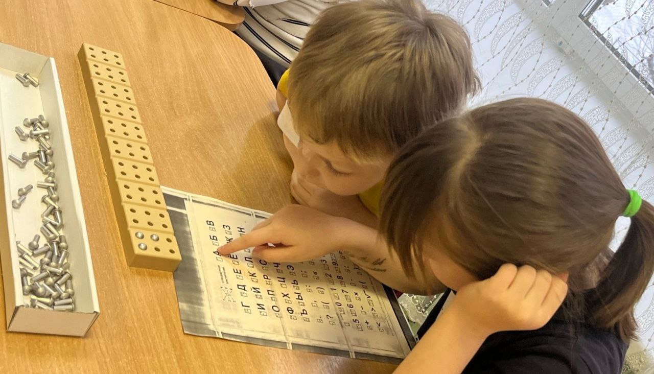 В загадочной стране «Тифлоприборов» ребятам были продемонстрированы грифель, брайлевские приборы для письма и чтения, специальные тетради. На разборной азбуке-колодке дети выложили шрифтом Брайля слово «дружба»