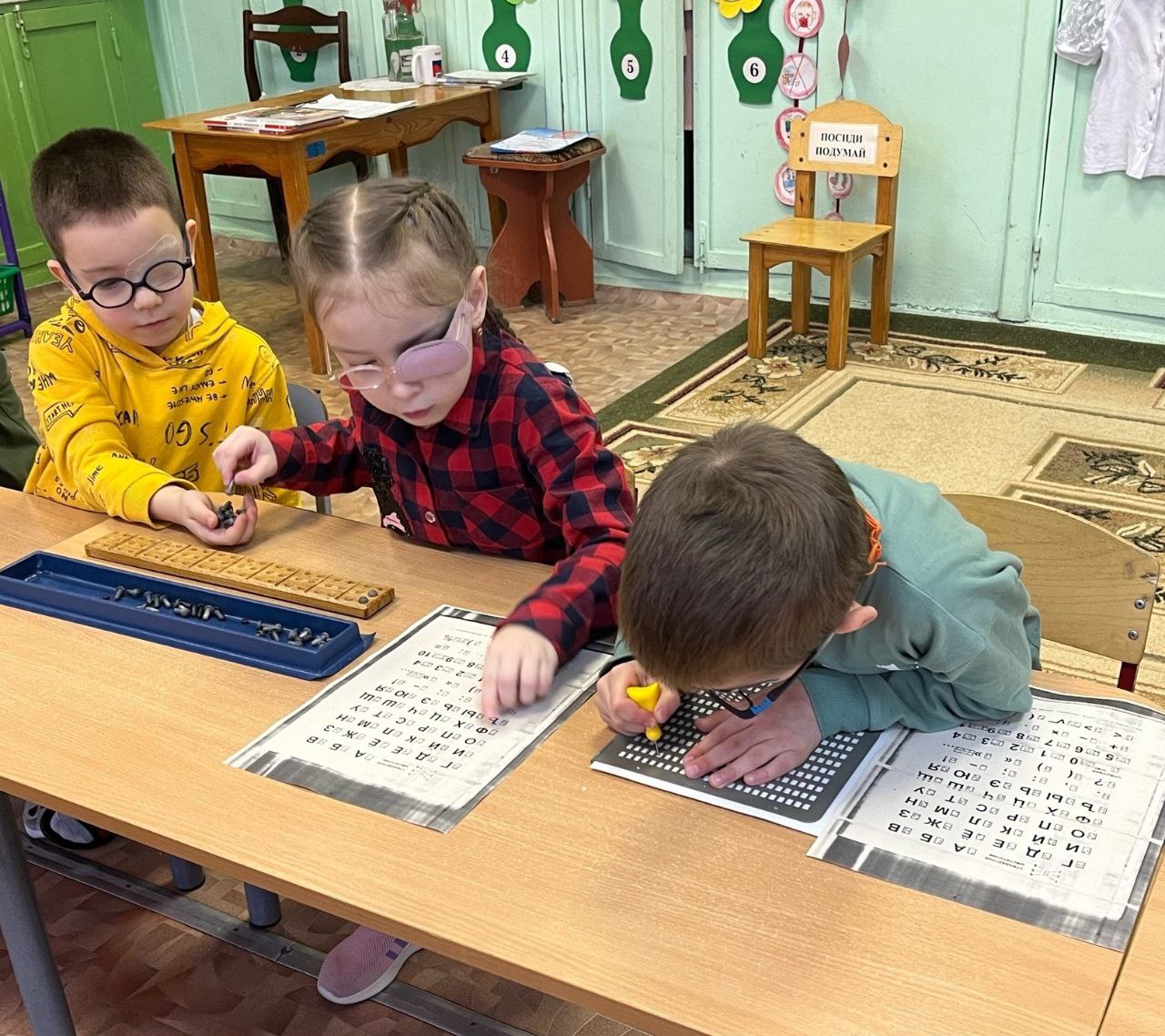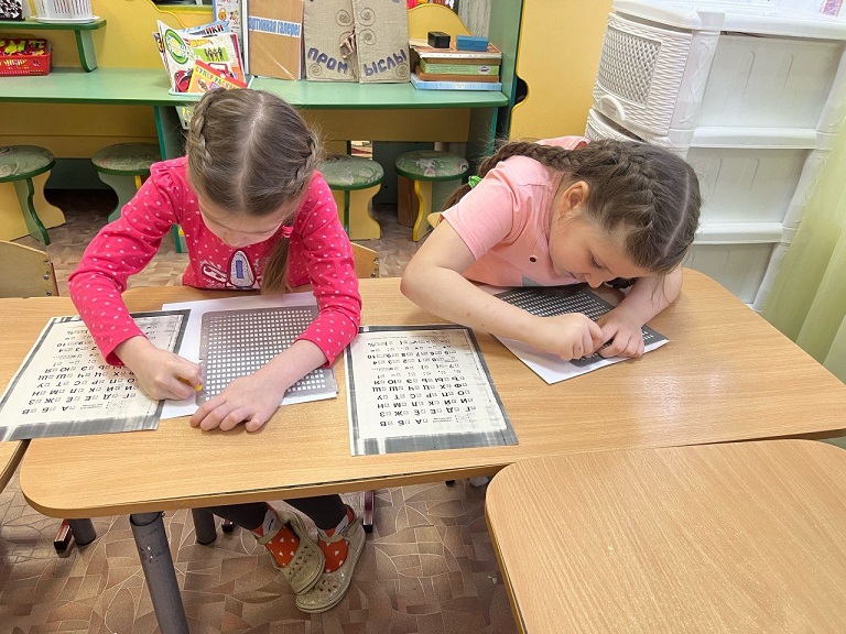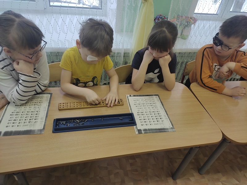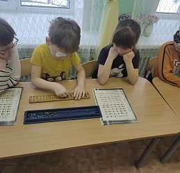 Пробивая грифелем буквы из комбинаций шеститочия, ребята с большим удовольствием сами создавали свои небольшие тексты и читали слова по Брайлю.