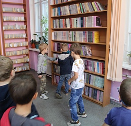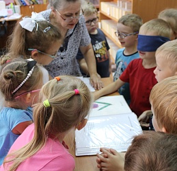 Дошкольникам предстояло побывать в «Городе загадок», «Городе сказочных героев», посетить «Спортивный городок» в литературном сквере (рядом с библиотекой), чтобы вернуть новое книжное библиотечное издание «АЗ, БУКИ, ВЕДИ», которое неуловимый «Похититель» сумел вынести из библиотеки в ночь накануне, спрятав на стеллажах конверты с заданиями для детей. (при этом «пострадал» библиотечный житель Ученый кот Мурлыка). Дошкольники азартно искали конверты с заданиями, успешно выполнили все задания, и вернувшись из «Спортивного городка», наконец-то смогли полистать необычные книжные страницы, найти рельефные рисунки на буквы алфавита, ответить на вопросы, такие как: «Почему арбуз полосатый», «Василёк всегда одного цвета» и т.п.