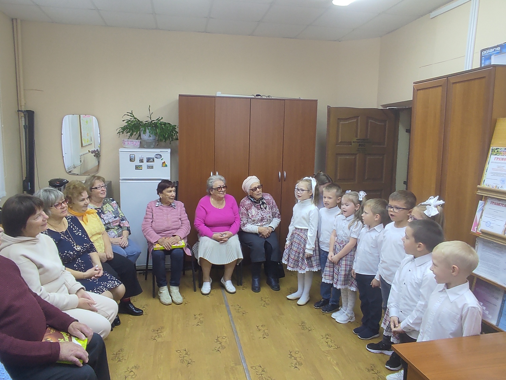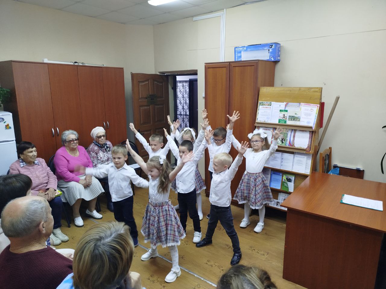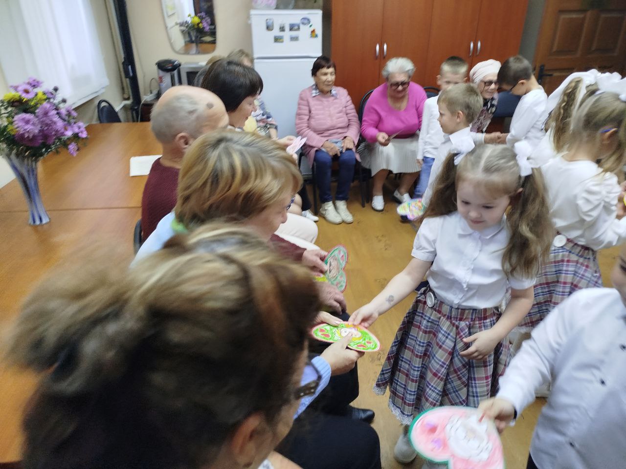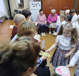 Воспитанники детского сада компенсирующего вида №7 исполнили весёлые задорные песни, прочитали стихи с добрыми пожеланиями в адрес собравшихся, вручили поздравительные открытки представителям старшего поколения, выполненные своими руками.
