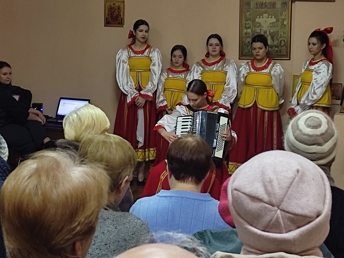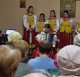 В духовно-просветительском центре «Пересвет» в рамках выездного читального зала для читателей Кинешемского филиала №1 28 ноября состоялся праздничный концерт «Поклонитесь, люди, матерям» коллектива «Сударушка» волонтерского отряда «Педагоги будущего» Кинешемского педагогического колледжа (руководитель Горнова Л.В., концертмейстер Глебов В.А.). Выступление коллектива запомнилось своей яркостью, неординарностью; исполнение песен сопровождалось танцевальными элементами. Звучали различные песни о маме в исполнении солистов. Задушевный репертуар праздничного концерта создал атмосферу тепла и уюта. Зрители с благодарностью принимали каждый номер, щедро награждая артистов аплодисментами.