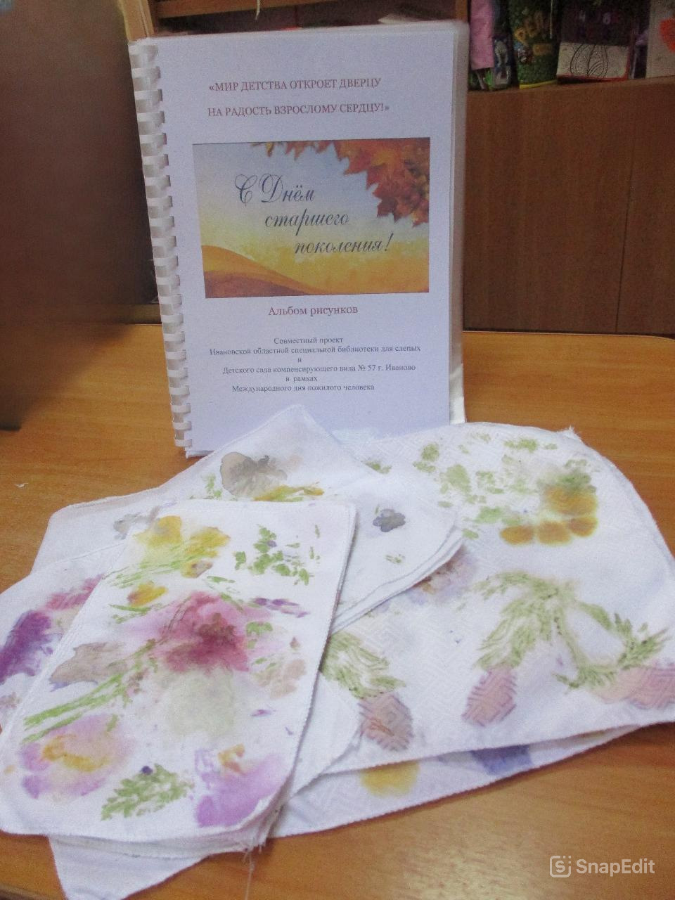 По завершении ретро-вечера библиотекой был подарен альбом «Мир детства откроет дверцу на радость взрослому сердцу» с рисунками, выполненными воспитанниками детского сада компенсирующего вида № 57 на занятии в Арт-мастерской «Синяя птица», в рамках Международного дня пожилого человека. Также подарком стали салфетки, оформленные ребятами в детском саду в стиле «Экопринт- цветочное рисование».