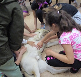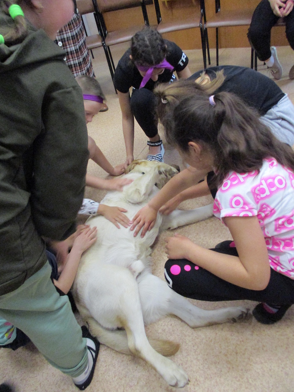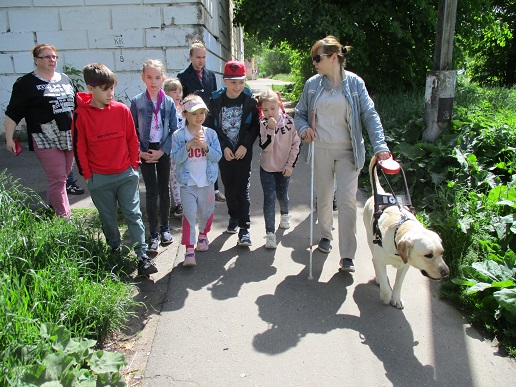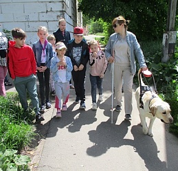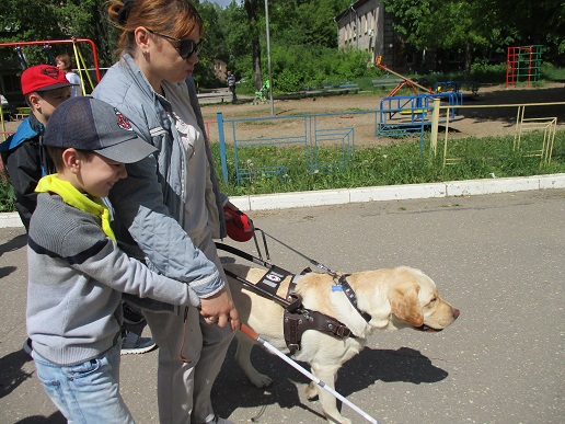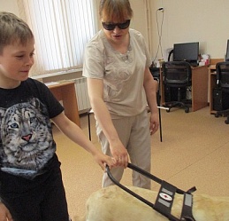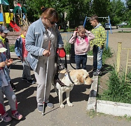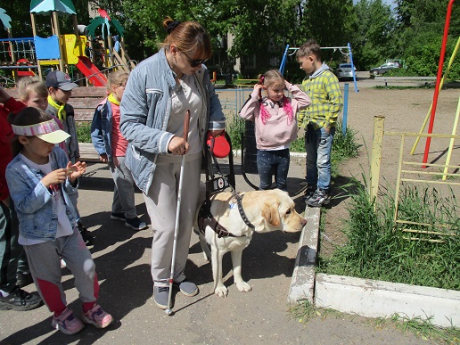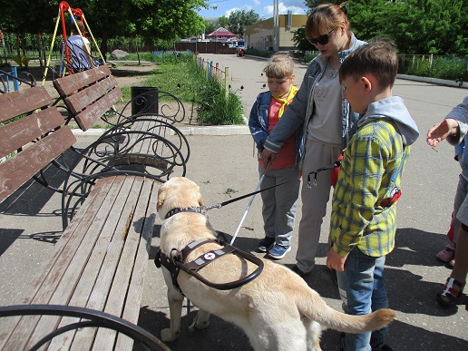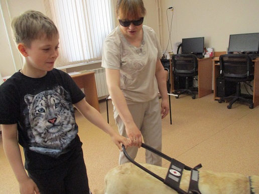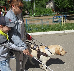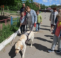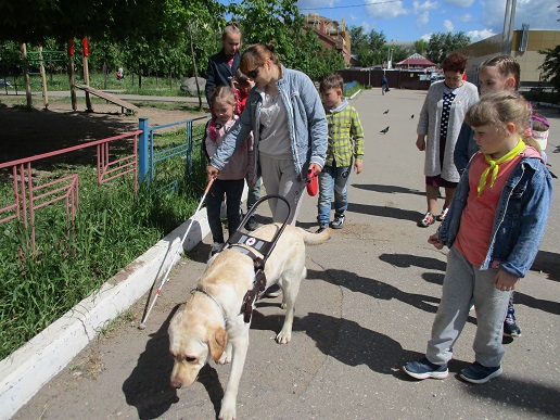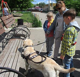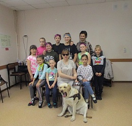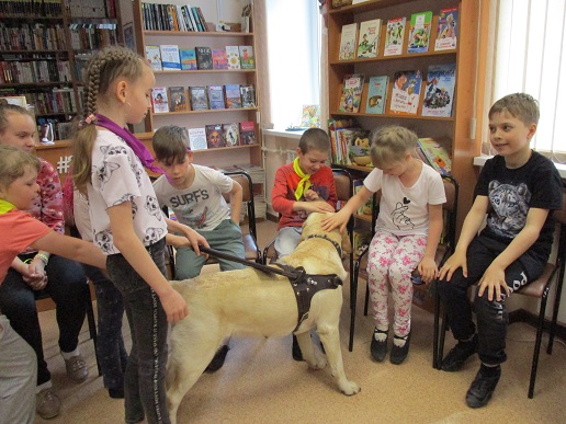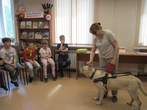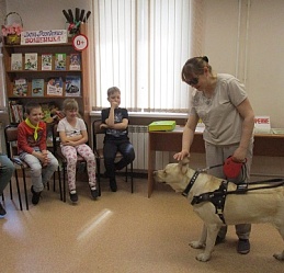 В рамках просветительского проекта «Наш читатель – инвалид» 7 июня состоялись совместные мероприятия с Библиотекой-филиалом № 27 ЦБС детских библиотек г. Иваново под названием «С надёжным другом все пути открыты». Участниками мероприятий стали поочередно две группы воспитанников Объединения спортивной хореографии «Маргарита» Муниципального бюджетного учреждения дополнительного образования «Центр внешкольной работы № 2». В гости к коллегам и детям пришли главный библиотекарь группы стационарного обслуживания Августа Алексеевна Виноградова и член Ивановской МО ВОС Светлана Александровна Каретина с собакой-проводником лабрадором Флаем. Заведующая библиотекой-филиалом № 27 (многолетнего социального партнёра нашей библиотеки) Светлана Васильевна Лакина, открывая каждое мероприятие, радушно представляла гостей, сообщая, что встречи проходят в преддверии Международного дня друзей; тем самым сразу же создавала дружескую атмосферу общения. Эстафету подхватила А.А. Виноградова, вкратце рассказав о брайлевской системе грамотности незрячего ребёнка, его помощниках в обучении. Интерес детей вызвало ознакомление с особыми книгами рельефно-точечного и укрупнённого шрифта на примере библиотечного издания повести о котёнке Габалино незрячей 11-летней читательницы Тони Сахаровой. Экземпляр типографского издания повести мы подарили библиотеке-филиалу, и теперь эта книга может быть прочитана и их юными читателями. Книга В. Бианки "Синичкин календарь" серии "Волшебный карандаш" также была с интересом встречена ребятами. Особым моментом мероприятий, состоявшихся друг за другом, стало общение со Светланой Александровной и Флаем, который уютно чувствовал себя в кругу новых знакомых. Светлана Александровна охотно продемонстрировала использование в своей жизни телефона с программой речевого доступа, рассказала о помощнице инвалида по зрению – белой трости, ответила на вопросы детей, в частности и о том, как без зрения можно приготовить пищу; поделилась советами о том, как правильно оказывать помощь при встрече с инвалидом по зрению при условии её необходимости. Конечно же, Флай очаровал всех, выполняя различные команды Светланы Александровны, например, поднимал упавшую трость и приносил хозяйке. Все дети тоже охотно выполнили задание гостьи: с помощью обоняния и с повязкой на глазах угадывали предлагаемые пищевые продукты – кофе, ванилин, цедры апельсина и мандарина, всем сложно было угадать гвоздику. Затем всей дружной компанией отправились на прогулку, где Флай показал свои профессиональные навыки – останавливался перед различными преградами, уверенно шёл, сопровождая каждого своего нового друга. Удивительно, что впервые побывав в помещении библиотеки, после прогулки Флай уверенно привёл всех назад, хотя маршрут предполагал не один поворот. И дети, и взрослые не раз награждали Флая аплодисментами за все выполненные команды, а от библиотеки-филиала Флай получил собачьи лакомства. Надеемся, что проведённое время общения было познавательным и полезным для юных читателей библиотеки-филиала № 27, где библиотека для слепых не раз проводила мероприятия в рамках просветительского проекта «Наш читатель-инвалид» в целях пропаганды возможностей и активного образа жизни незрячего человека, в том числе, ребёнка-инвалида по 