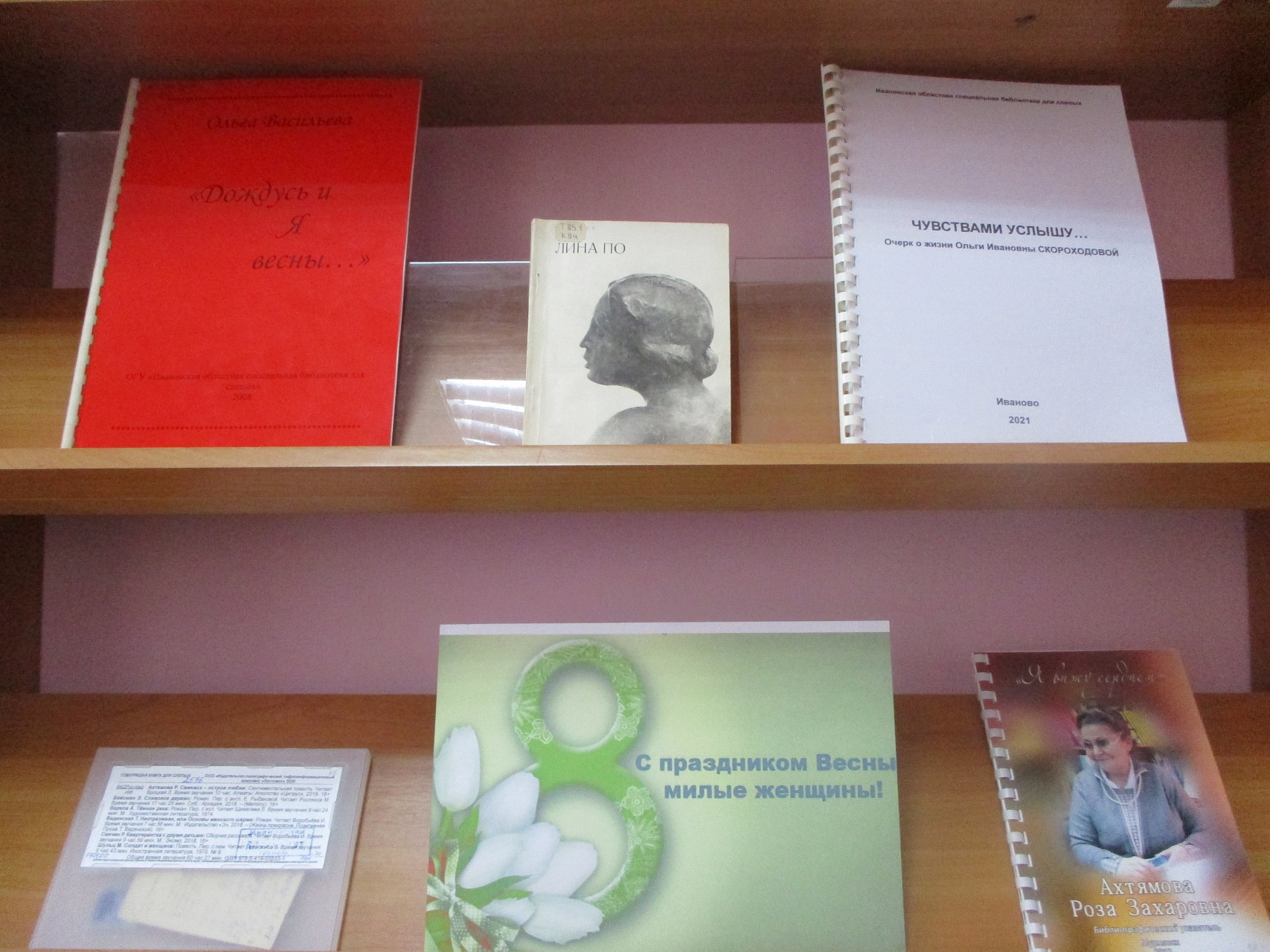 В преддверии празднования Международного женского дня в библиотеке оформлена книжная выставка «С праздником Весны, милые женщины!», посвященная прекрасной половине человечества. Темой выставки стал образ женщины в литературе и истории. Книги, представленные на выставке, раскрывают неизвестные страницы в биографиях и творчестве. Автор здесь – женщина, главная героиня тоже женщина, сам сюжет связан с женской судьбой.