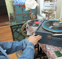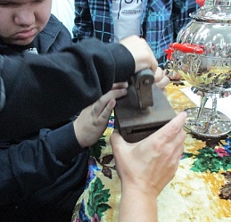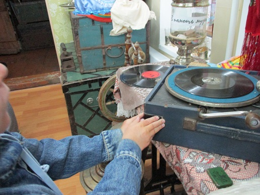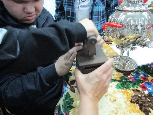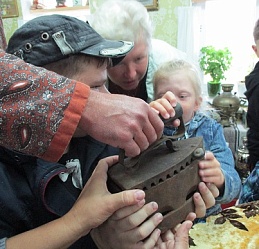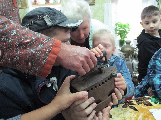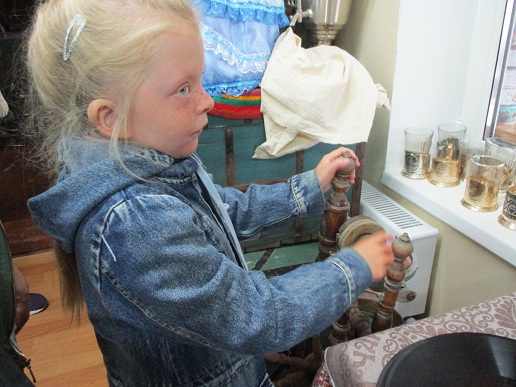 И хотя за окнами был ещё далеко не вечер, но всё же пасмурное серое небо, самовар на столе, сушки и баранки, чай с мятой, часы с кукушкой, звучание патефона создавали неповторимое настроение; ведь наш самовар — символ русского гостеприимства, теплой дружеской беседы за чашкой чая. Дети задержались ещё и старинного угольного утюга, прялки и китайского самовара « Хо- Го».
