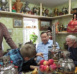Старинные и современные, парадные и повседневные, трактирные и небольшие дорожные, самовары-чайники, самовары-сбитники, латунные и медные, в форме банки, шара, конуса и самых непредсказуемых форм, величины и цвета, разместились в небольшой комнате частного дома-музея, где за овальным столом разместились экскурсанты - « в тесноте – да не в обиде».