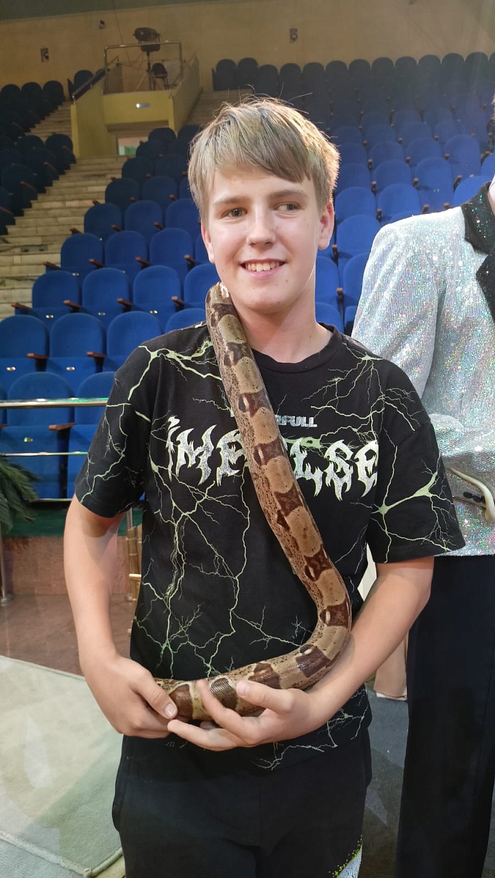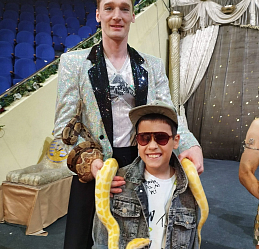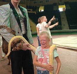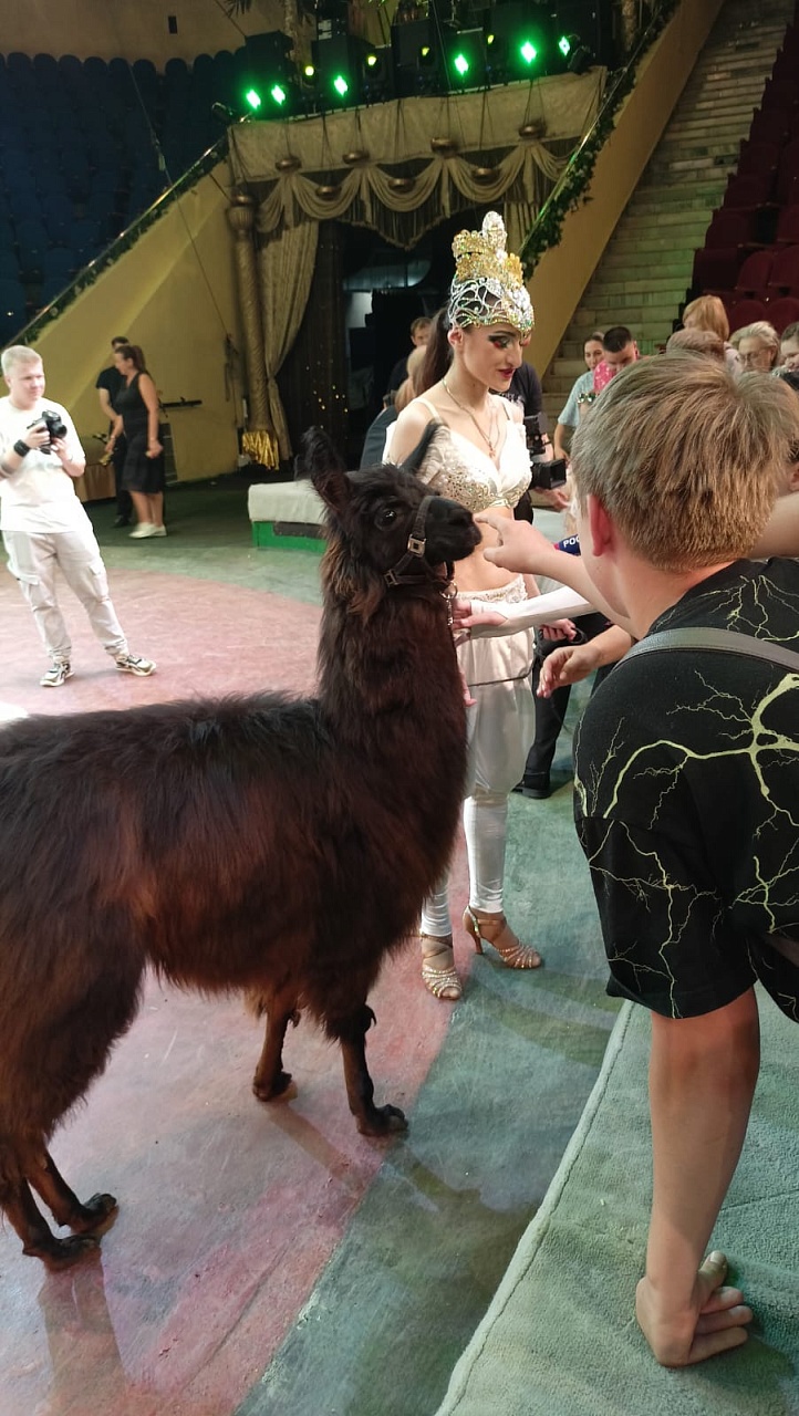 Восторг юных клубовцев вызвало также общение с цирковыми артистами, в том числе, и тактильное с ламой, питоном «Лимоном», ламой и собакой «Кнопой» на арене цирка после представления.