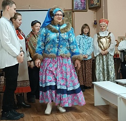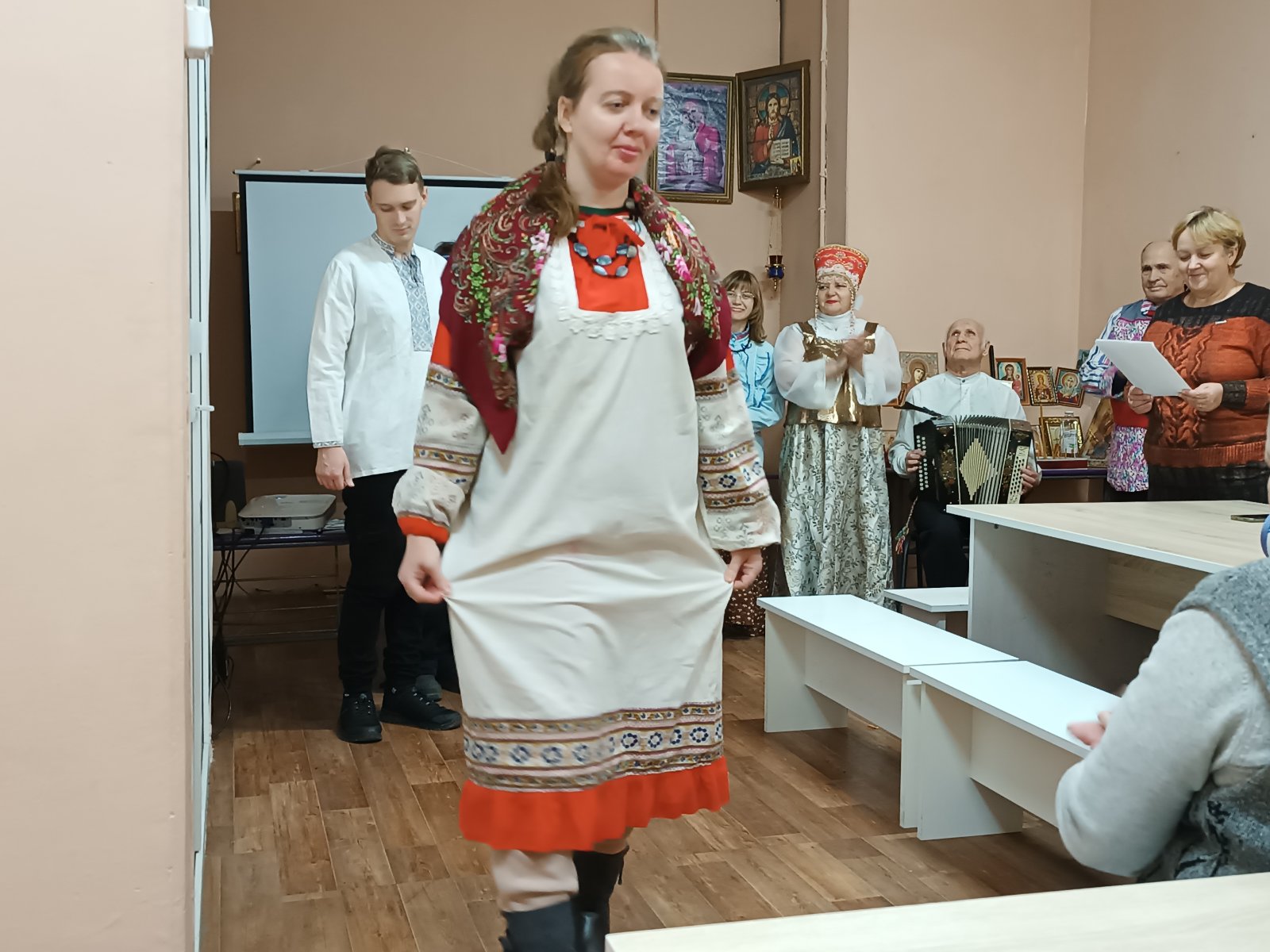 В первой части программы, Арт-часе «Поэзия народного костюма», ведущий библиотекарь Кинешемского филиала Марина Горбачева ознакомила участников встречи с историей и традициями русского костюма с Древней Руси и до XVII–XIX веков. Из коллекции работ Натальи Ильиничны Кляузовой была представлена небольшая экспозиция элементов русского народного костюма: сарафаны и мужские рубахи, зимний народный костюм, а также женские головные уборы.