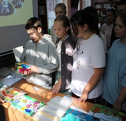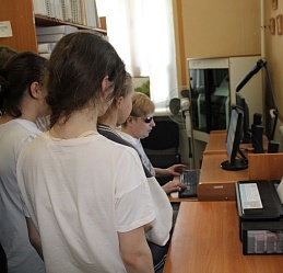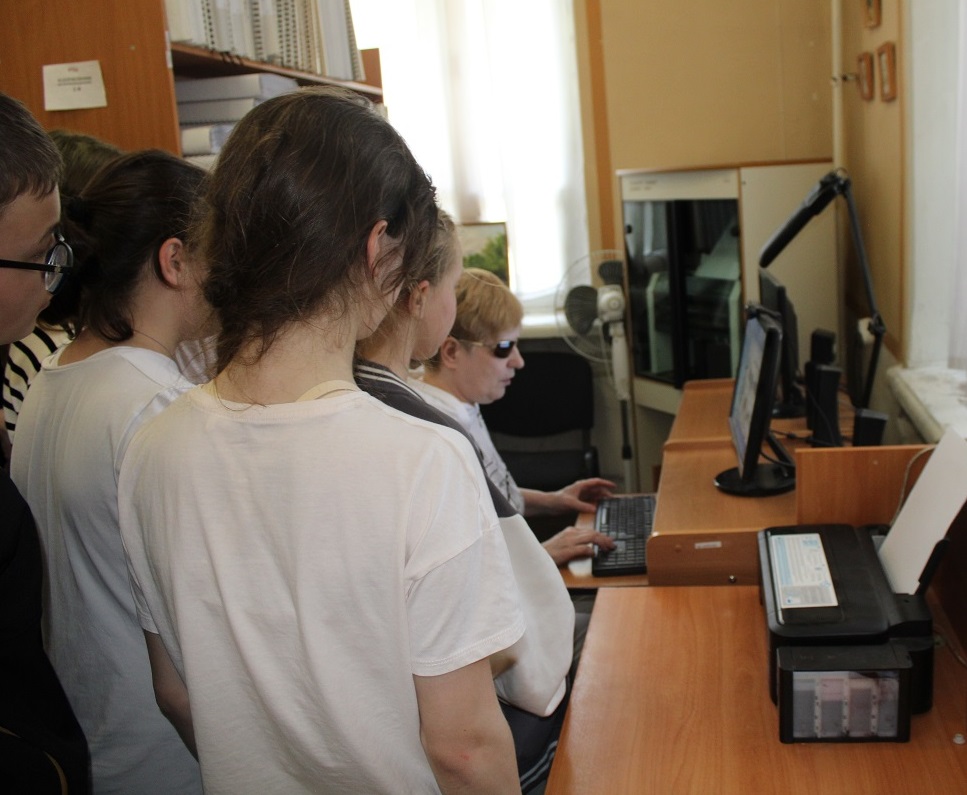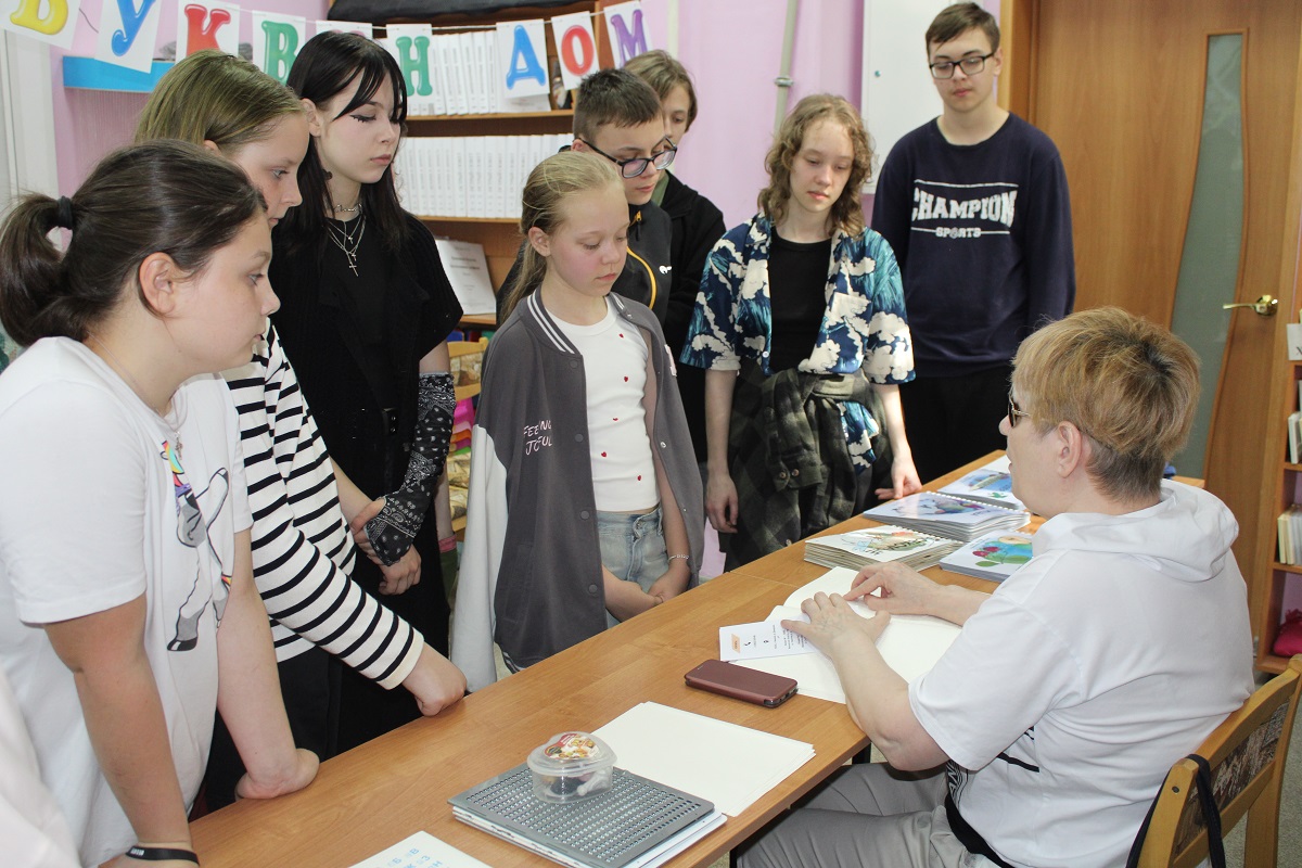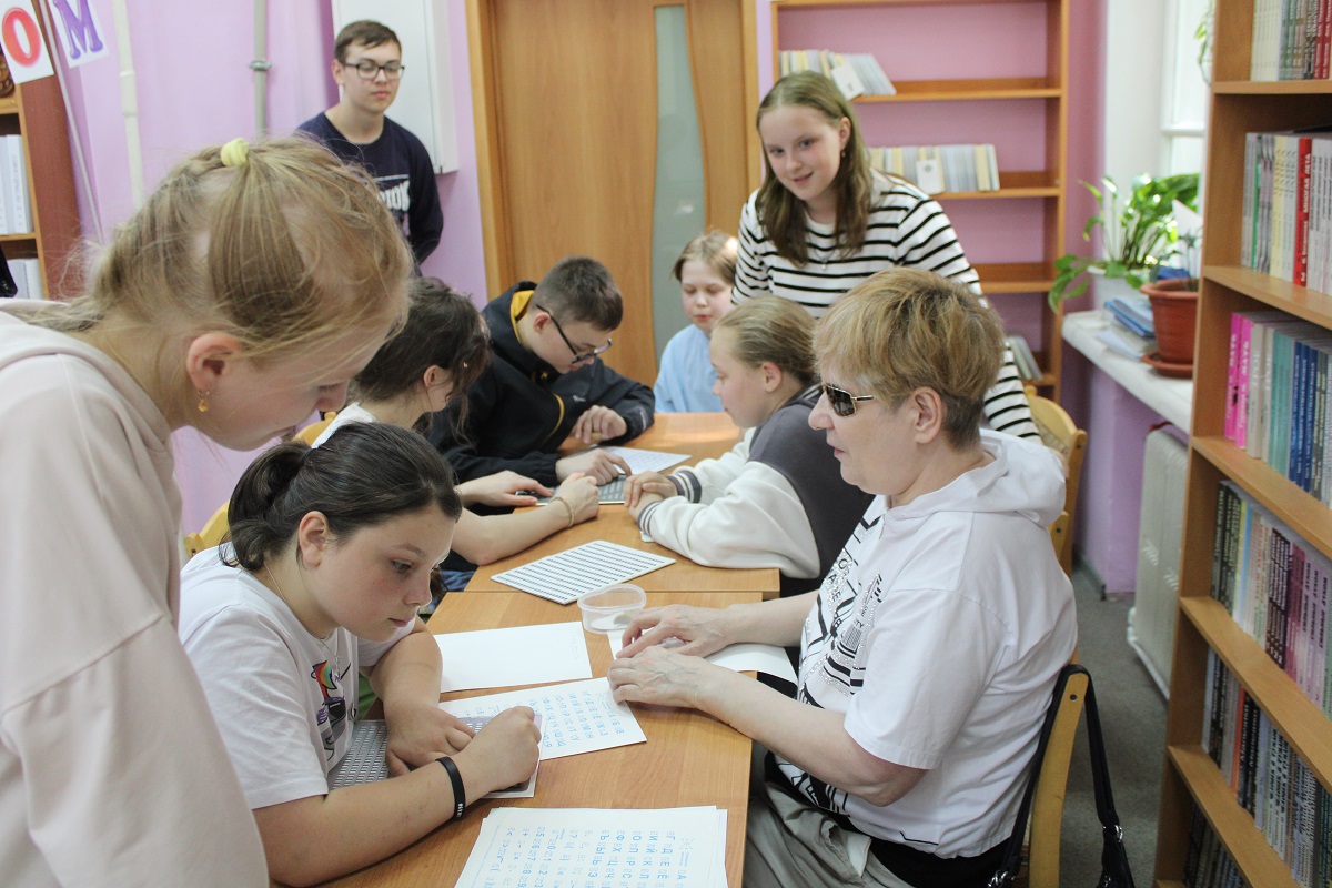 В целях содействия организации досуга для участников детских летних лагерей в библиотеке 3 июня был проведён тематический час «Очевидное-невероятное» для ребят летнего городского клуба дневного пребывания Центра развития для детей и взрослых «CREATE». В ходе беседы у выставки «Особая книга» школьники ознакомились с краткой биографией Луи Брайля, создателя системы грамотности слепых; со специальными книжными форматами, позволяющими их незрячим и слабовидящим сверстникам получать образование, иметь представление о явлениях и предметах окружающего мира. Незрячий читатель библиотеки Ирина Авлиева прочитала басню И.А. Крылова «Ворона и лисица» (РТШ), рассказала о том, что благодаря развитию технологий люди с инвалидностью по зрению самостоятельно пользуются различными гаджетами - с помощью голосовых помощников могут читать, писать, общаться в социальных сетях. Ирина Анатольевна продемонстрировала также технику письма незрячими на специальном приборе, что вызвало неподдельный интерес у ребят, и они практически без ошибок написали несколько слов. Интересным для них стала и демонстрация самостоятельной работы Ирины Авлиевой на ПК (автоматизированное рабочее место для инвалида по зрению).