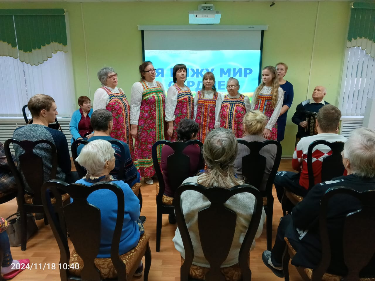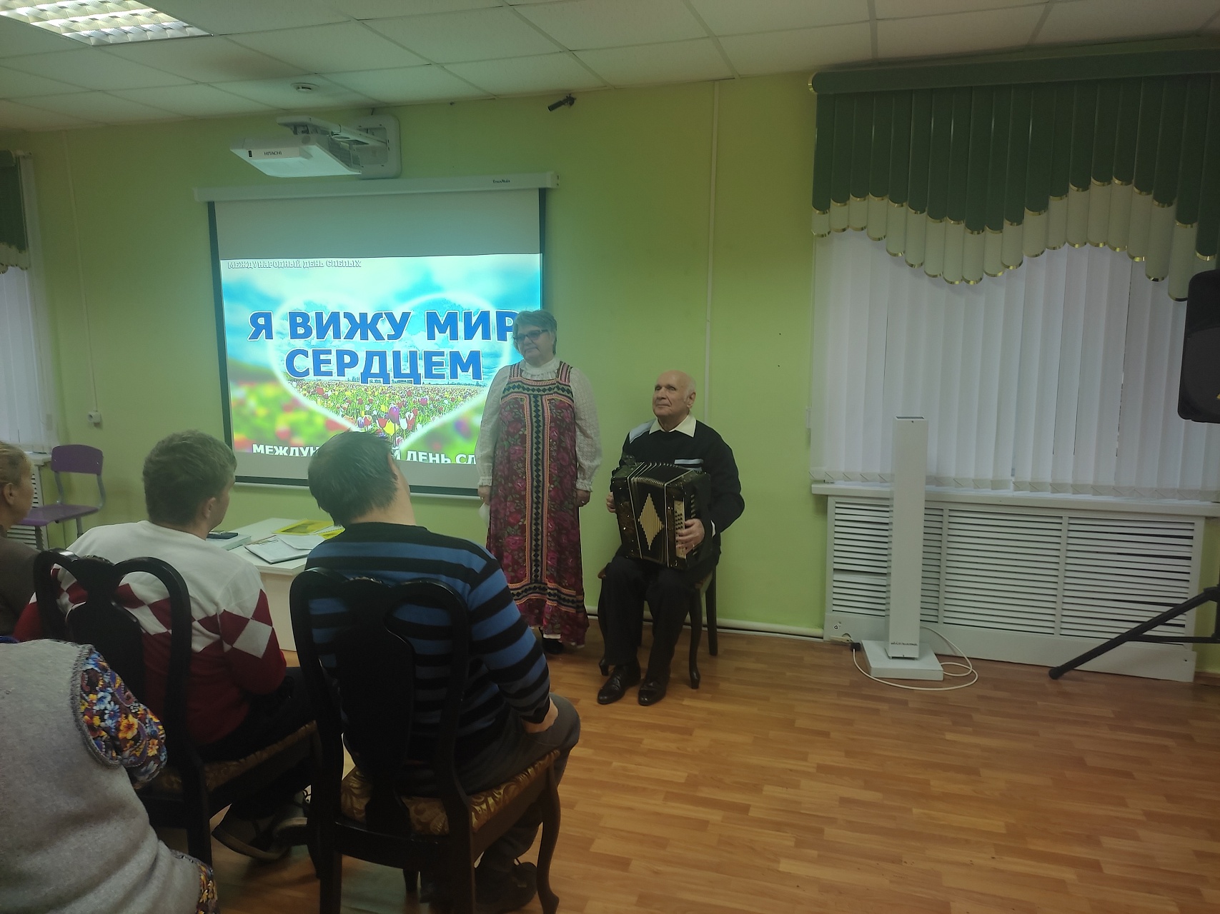 Собравшиеся в зале с большим удовольствием послушали наигрыши, лирические песни, частушки в исполнении инвалидов по зрению Сергея Сизова и Натальи Кляузовой, песенные произведения в исполнении вокального ансамбля «Калинушка» Кинешемской МО ВОС под руководством Сергея Болотова.