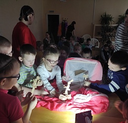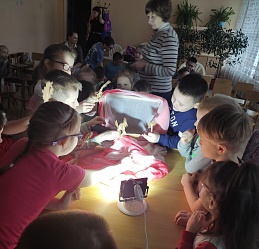 Артистичное чтение текста, игра теней рассказали детям историю о том, как забавные жители осеннего леса учатся дружить, быть смелыми и выручать друг друга в беде. Зрители с интересом смотрели необычное представление, доставившее им огромное удовольствие; дети сопереживали героям и громко аплодировали. По завершении спектакля ребятам было предложено попробовать себя в роли кукловодов и они с этим успешно справились..