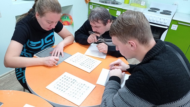 Анастасия Александровна Курмакаева, незрячий читатель, давний друг библиотеки для слепых, провела мастер-класс по обучению написания текстов рельефно-точечным шрифтом Брайля.