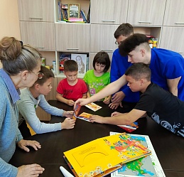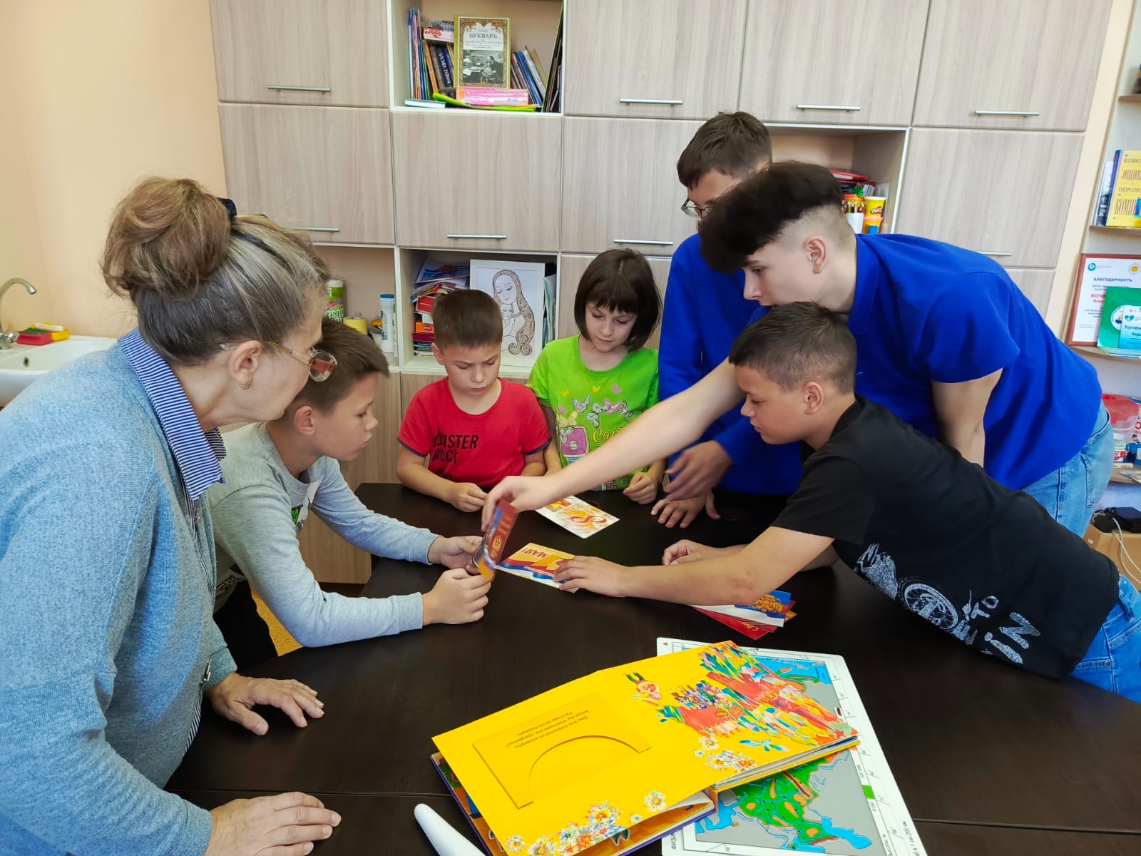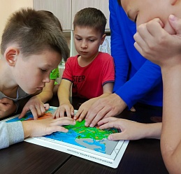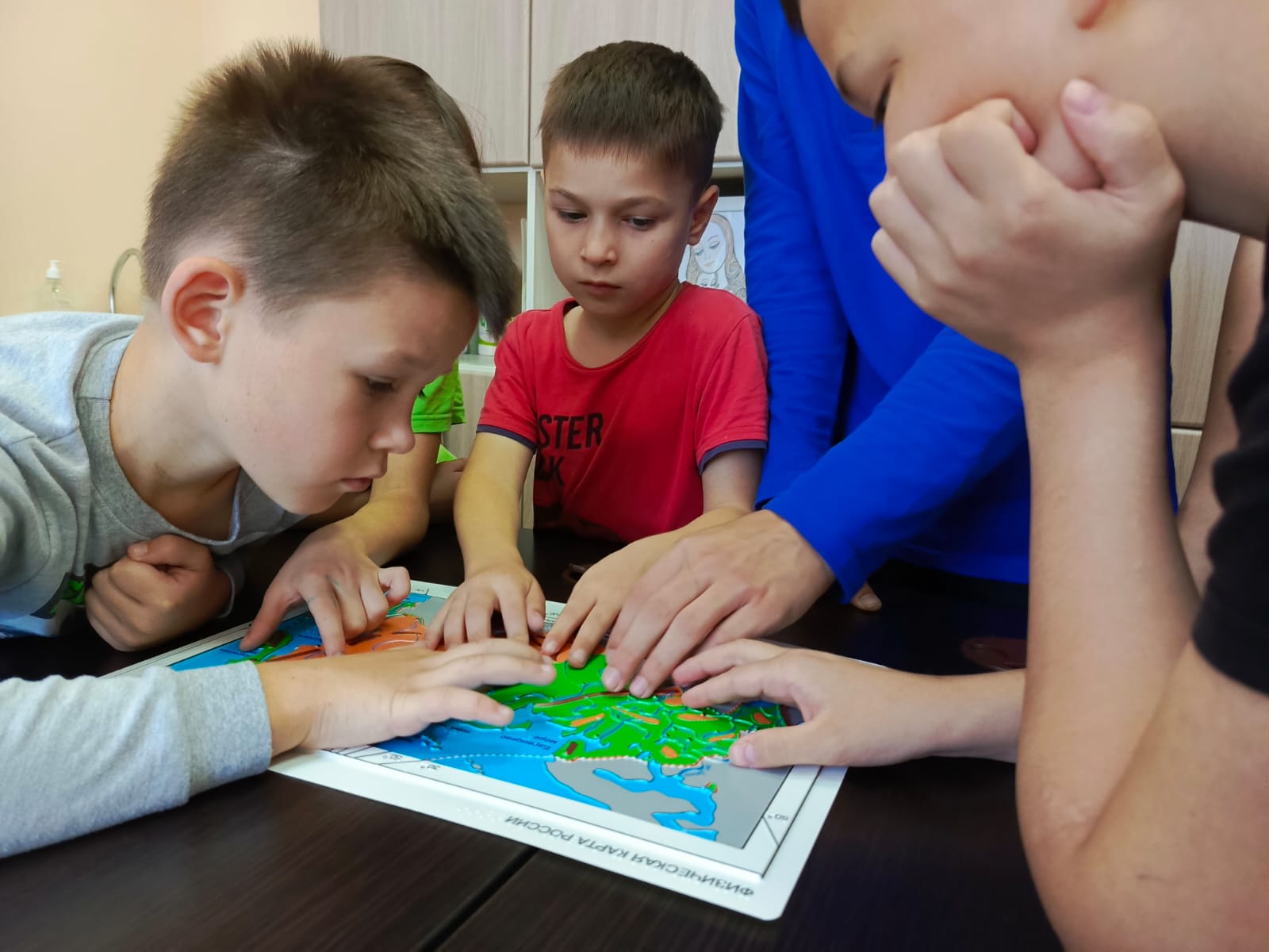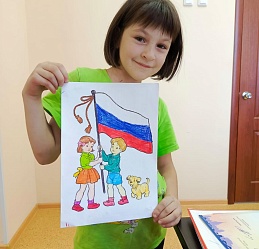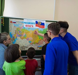 В программе: работа у физической и тифлокарты России, «чтение» книжных изданий «Таёжные сказки» и «Гимн России в детских рисунках» серии «Волшебный карандаш» с выполнением занимательных заданий; изучение истории современного Флага России и в завершении рисование-раскраска предложенных изображений по теме встречи.