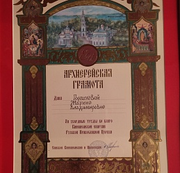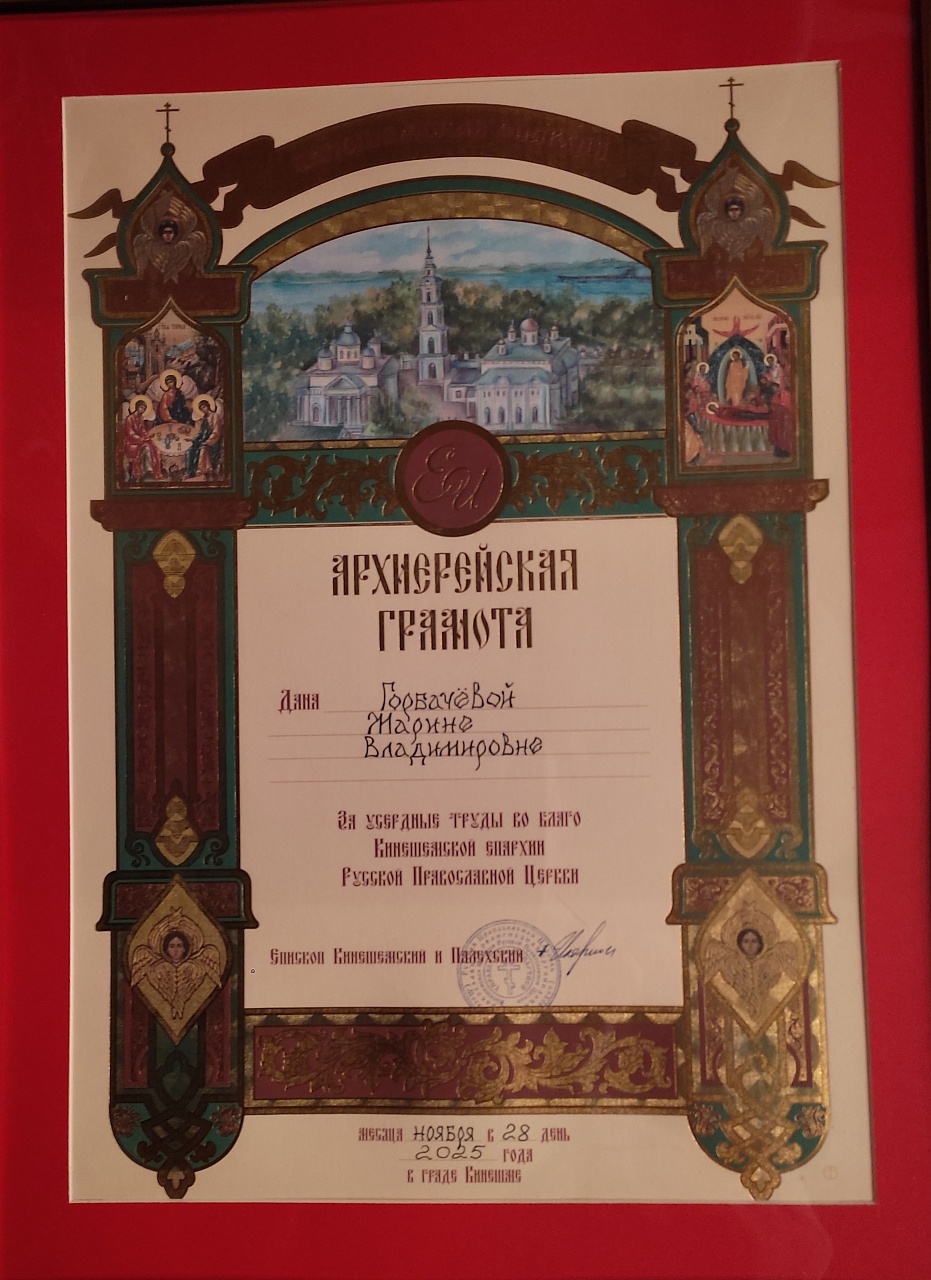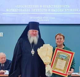 На пленарном заседании епископ Кинешемский и Палехский Иларион наградил ведущего библиотекаря Кинешемского филиала №1 Марину Владимировну Горбачеву Архиерейской грамотой за труды во благо Русской Православной Церкви.