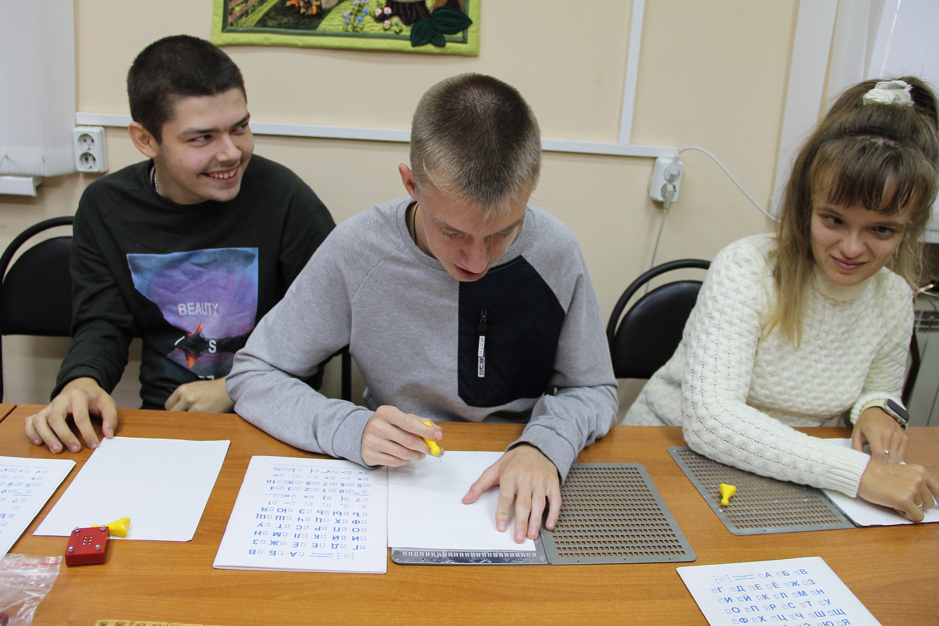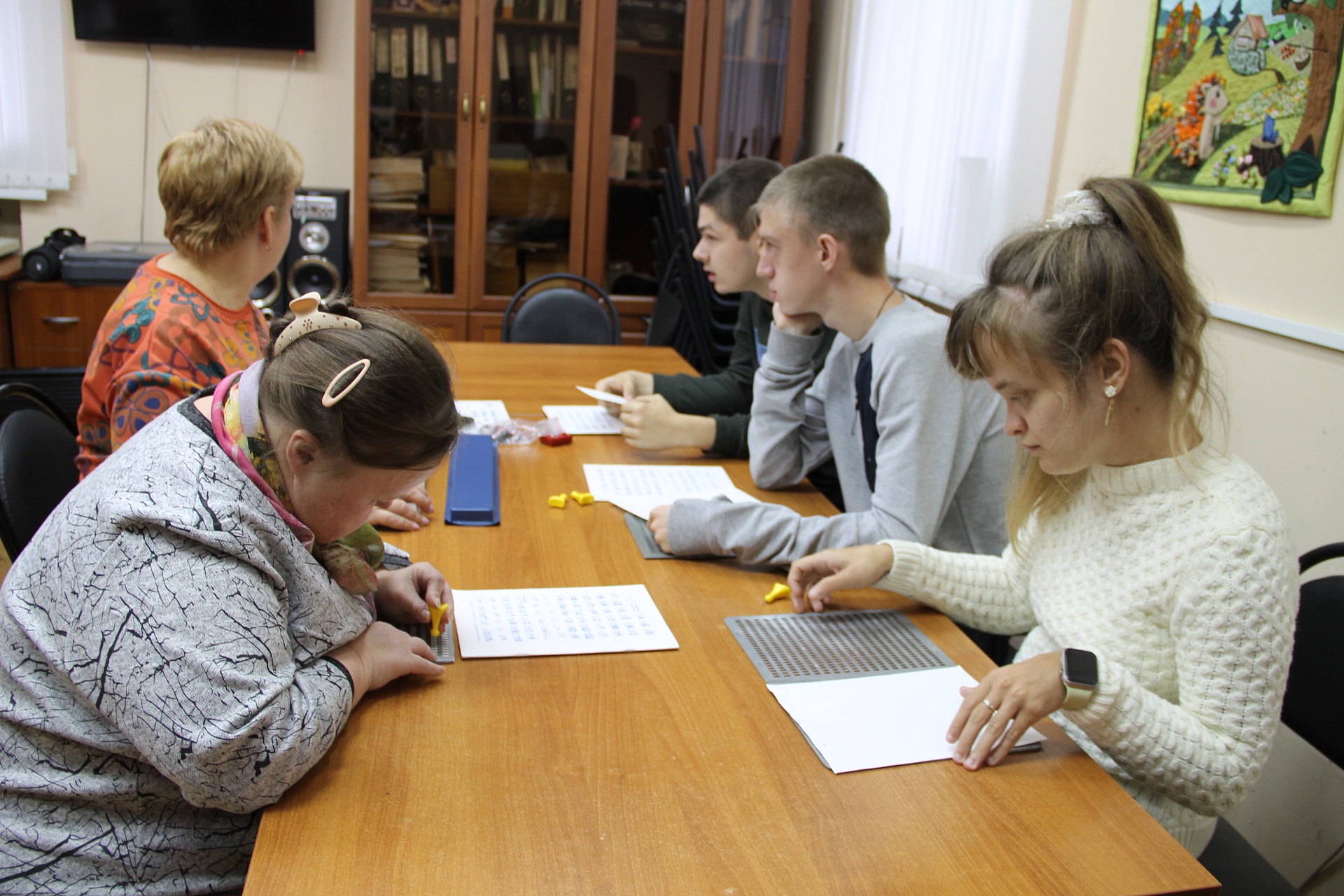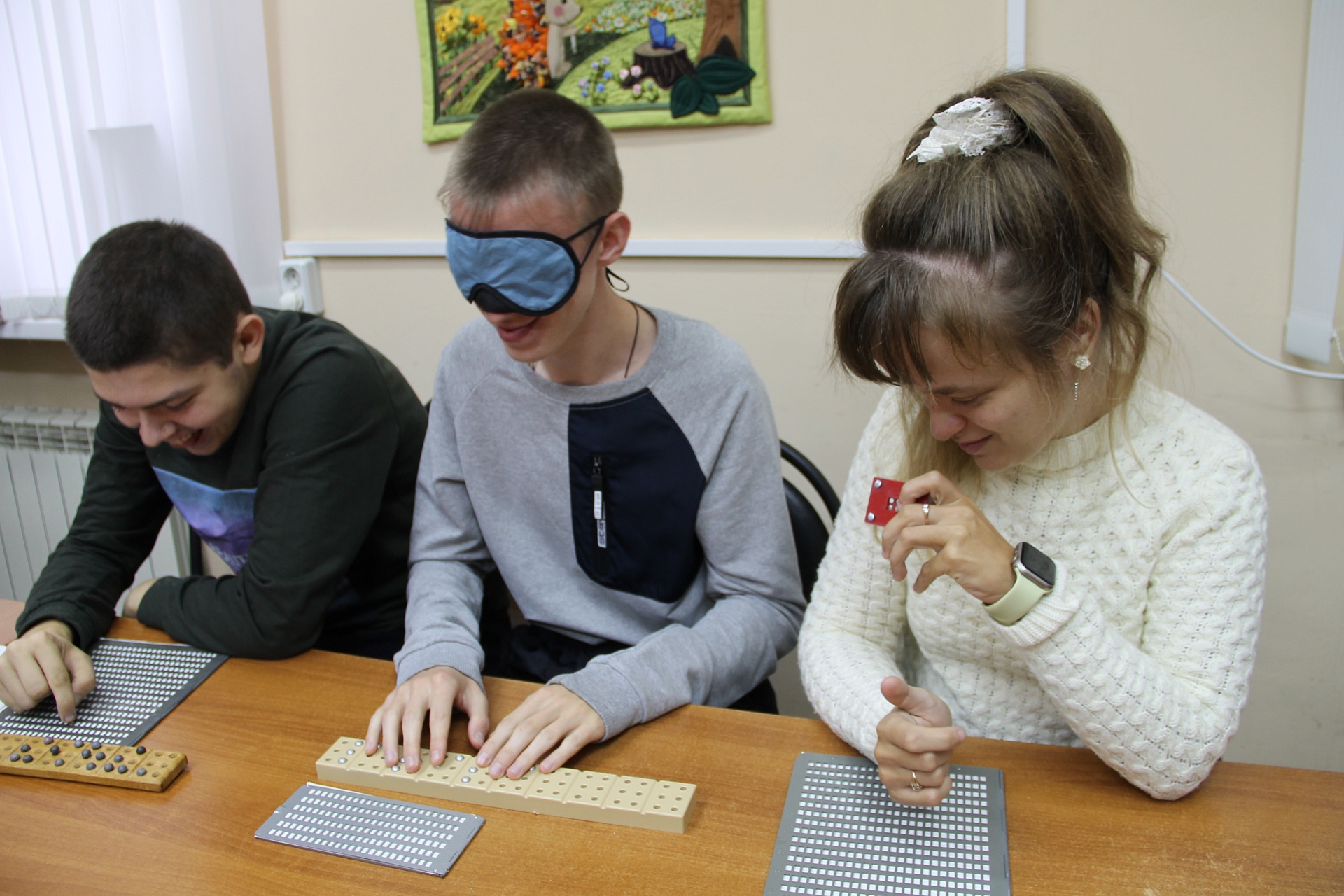 Из рассказа библиотекаря ребята узнали об истории возникновения Международного дня Белой трости; о том, что при чтении и письме слабовидящие и незрячие люди используют шрифт Брайля, а также попробовали тактильно почувствовать буквы алфавита и написать своё имя шрифтом Брайля. Были продемонстрированы книжные издания сказок «Волшебный конь» и «Обезьянье царство» Благотворительного фонда «Книжки для маленьких слепых детей» (серия «Волшебный карандаш»).