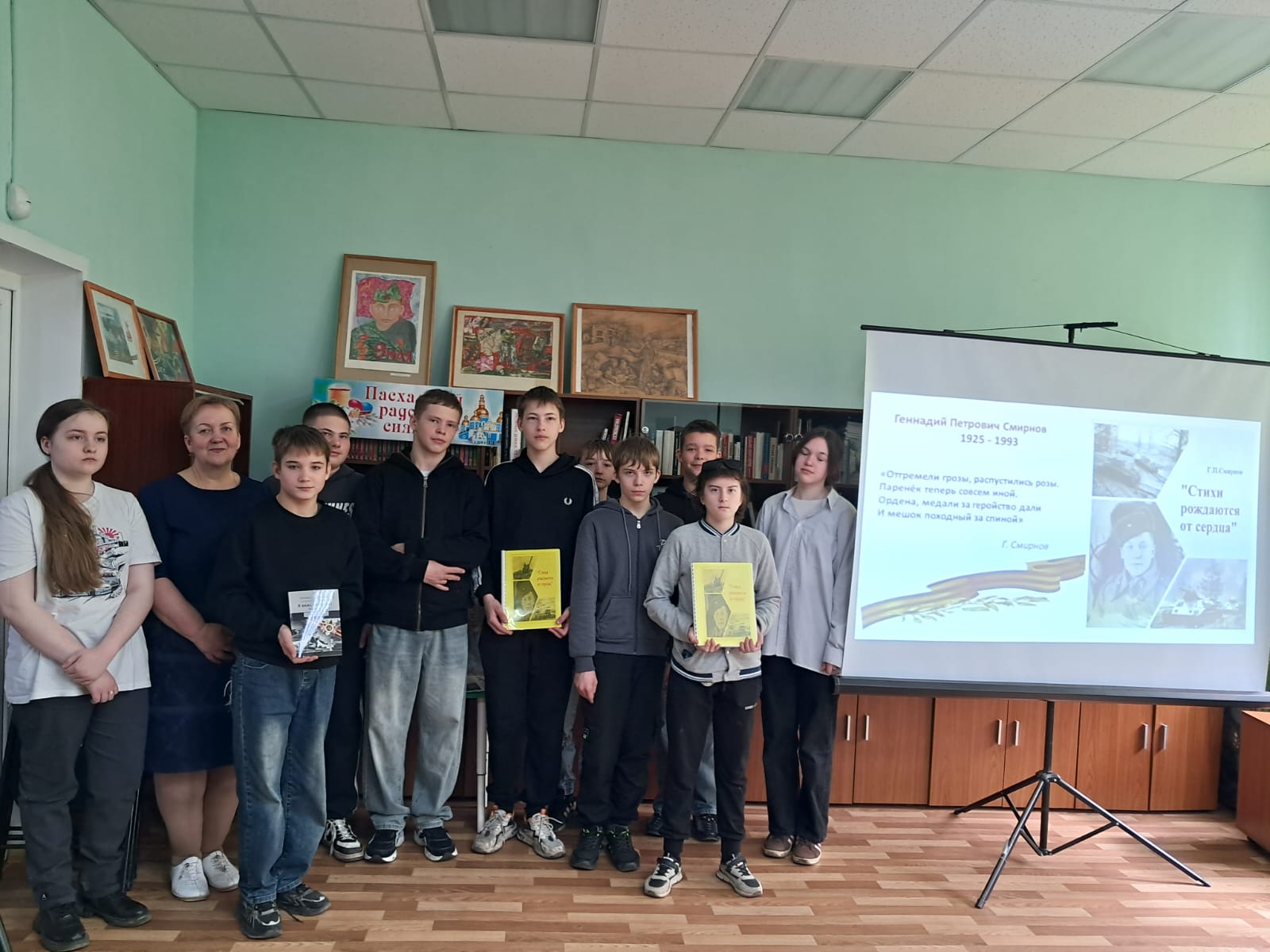 На основании сборника «Стихи рождаются от сердца», изданного Ивановской областной библиотекой для слепых, молодые люди ознакомились с судьбой и поэтическим творчеством инвалида Великой Отечественной войны, ветерана ВОС, уроженца г. Кинешмы Геннадия Петровича Смирнова. В ходе урока прозвучали стихи Геннадия Смирнова, проникновенно передавшие боль и героизм военного времени.