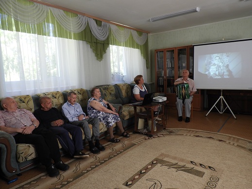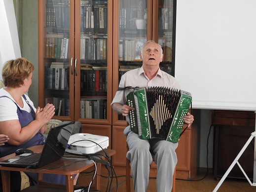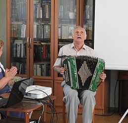 А затем зазвучала гармонь, такая певучая и родная, близкая сердцу русского человека. И часы пролетели как одно мгновение, растворяясь в музыке, которой были наполнены сердца, отзывавшиеся мелодиям. И как было не поддаться обаянию этого чудесного инструмента. Под аккомпанемент Сергея Борисовича Сизова дружно пели песни: «Катюша», «Ой рябина кудрявая», «При лужке», «Одинокая бродит гармонь» «Огней так много золотых» и другие; еще звучали частушки, задорные зажигательные припевки. Под звуки вальса «Дунайские волны» участники вечера танцевали.