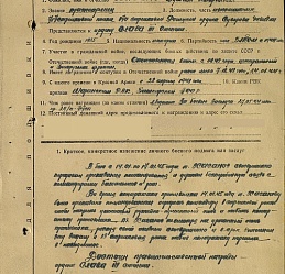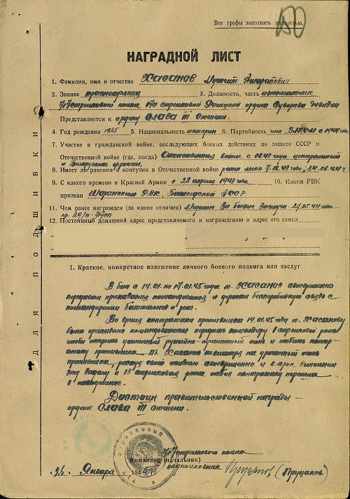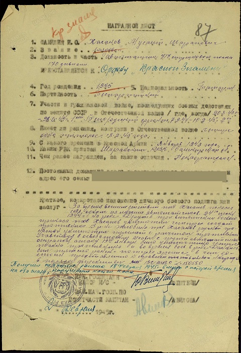 "За время военных действий тов. Хасанов показал себя одним из лучших автоматчиков. Во время боёв в районе Данцига ... получил тяжёлое ранение 18 фев. 1945 г. в лицо с потерей зрения на оба глаза, нарушений костей носа...".