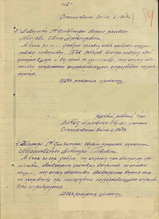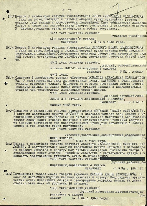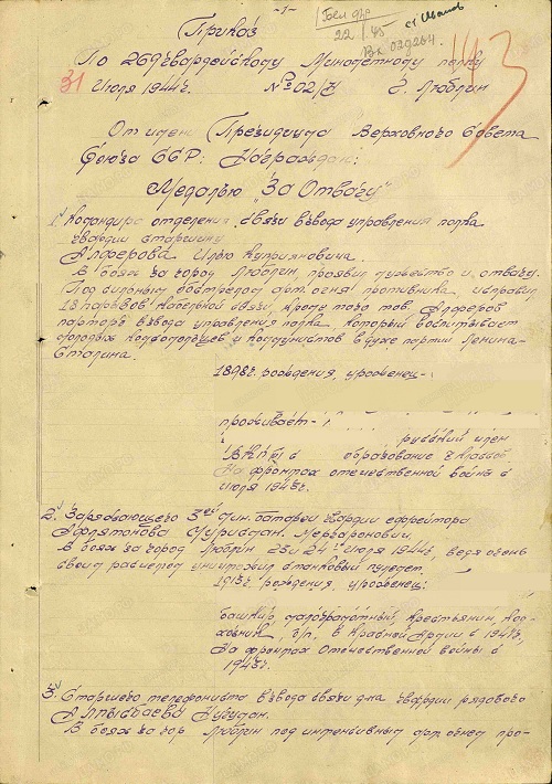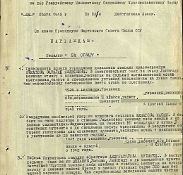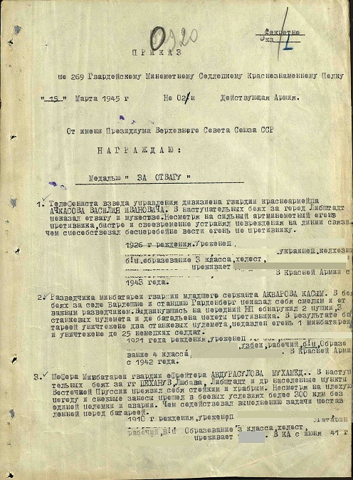 Выписка из наградного листа: «В наступательных боях за населенные пункты Барлашен и Вельбрандеве показал мужество и отвагу. Под сильным обстрелом противника быстро и своевременно менял огневую позицию совместно с расчетом, что давало возможность своевременно открывать огонь по противнику». (Выписка из приказа по 269 Гвардейскому Минометному Седлецкому Краснознаменному Полку №02/н от 15.05.1945 г. о награждении медалью «За боевые заслуги»).