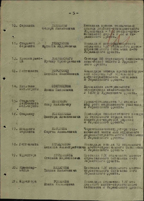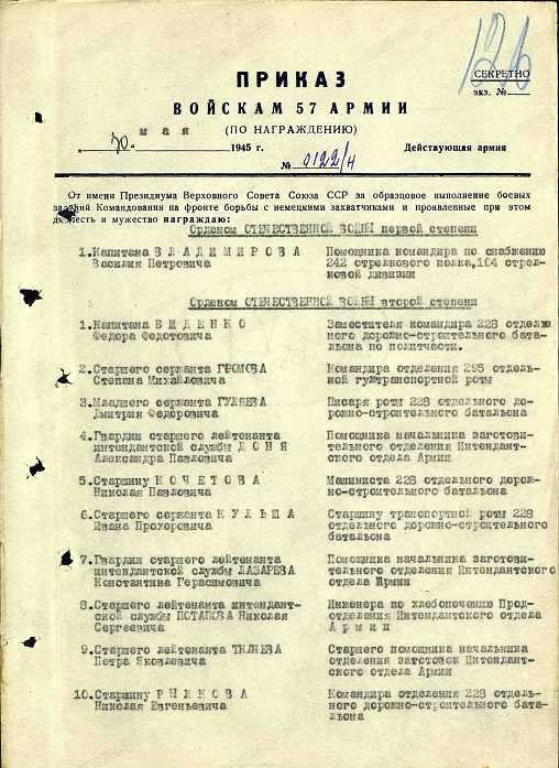 Выписка из наградного листа: «Последующей работой, как чертежник – конструктор батальона, не считаясь со временем, выполняя задания командования досрочно и качественно по разработке и составлению проектов, чертежей и схем мостов и материалов технической разработки дорог, выполняя и другие работы по партийной линии. Способствовал успешному восстановлению и постройке мостов и продвижению наших боевых частей. Исключительно дисциплинирован и трудолюбив. Достоин награждению правительственной награды орденом «Отечественной войны II степени».
