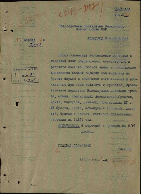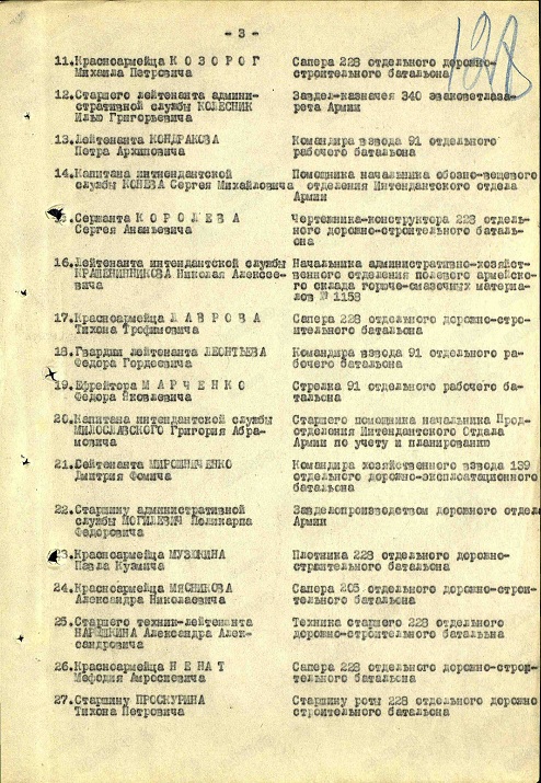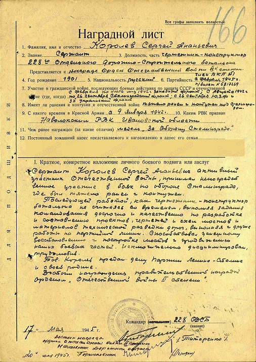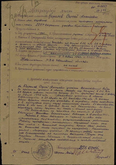 Работая в этом батальоне, товарищ Королев проявил себя исключительно трудолюбивым, дисциплинированным работником. Работая чертежником – конструктором технической части дело свое любит и выполняет аккуратно. Кроме своей работы он выполнял много поручений по партработе. Политически развит. Морально устойчив. За отличную работу имеет ряд благодарностей от командования батальона. Предан делу партии, Ленина–Сталина и Социалистической родине. Товарищ Королев заслуживает представления к правительственной награде – медали «За боевые заслуги».