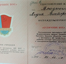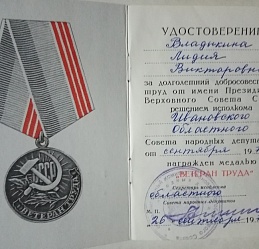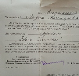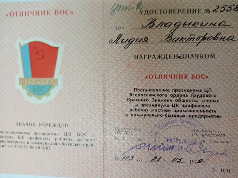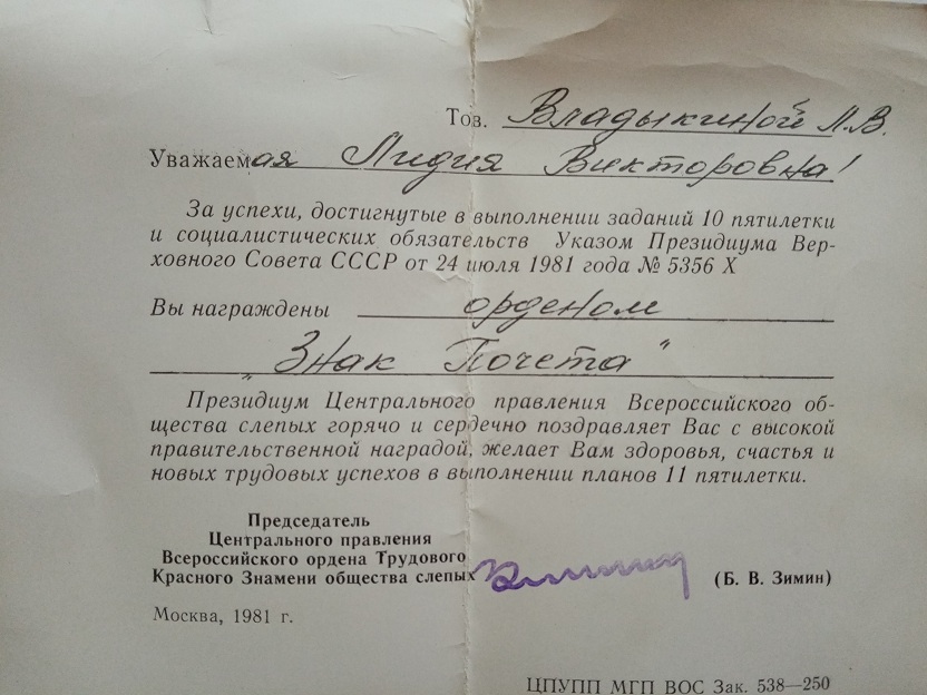 Имеет медаль «Ветеран труда», значок «Отличник ВОС». За успехи, достигнутые в выполнении заданий 10 пятилетки и социалистических обязательств, а также за активную общественную работу, Указом Президиума Верховного Совета СССР от 24 июля 1981 года Владыкина Лидия Викторовна была награждена Орденом «Знак Почета». Жаль, что она рано ушла из жизни. Я горжусь своей мамой, ведь в тяжелые годы войны, пройдя через голод и разруху, она сумела получить хорошее образование и смогла, как я думаю, принести нашему обществу слепых большую пользу».