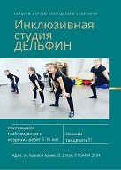 Инклюзивная студия "Дельфин" приглашает незрячих и слабовидящих детей в возрасте 7-15 лет на занятия по обучению танцам, способствующим развитию координации движения, чувства ритма и равновесия