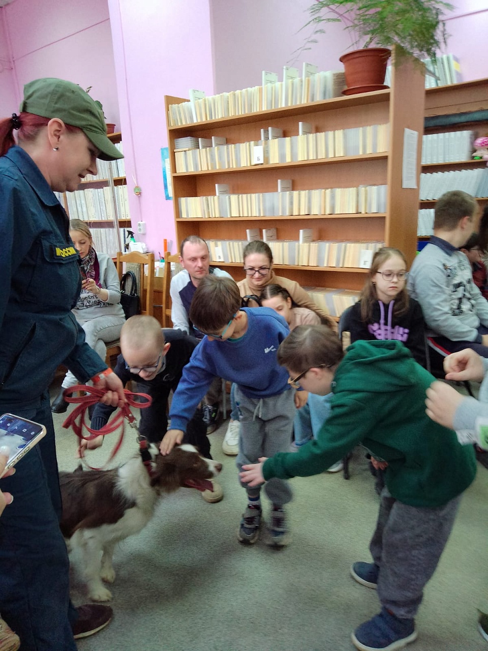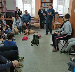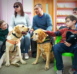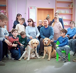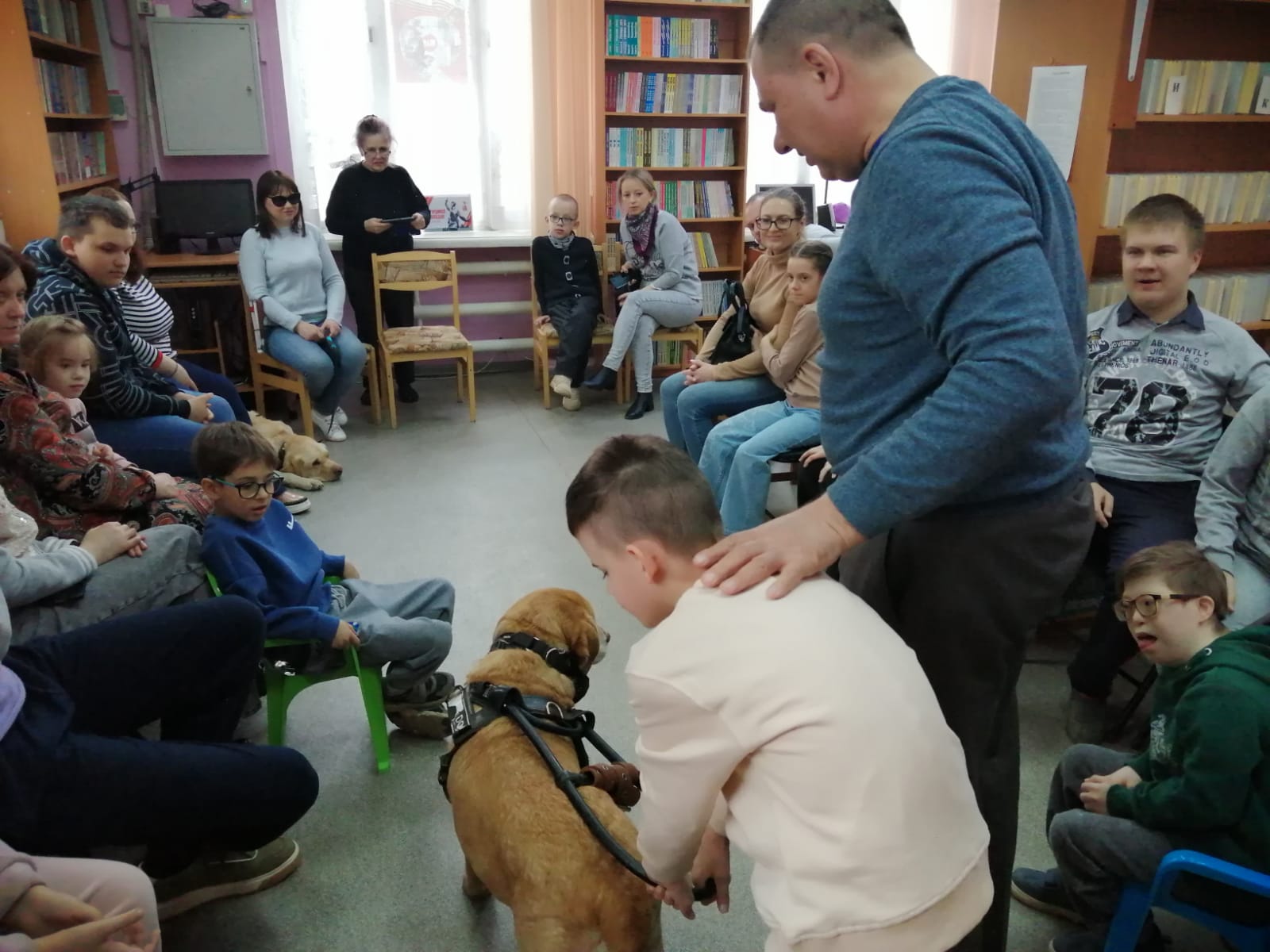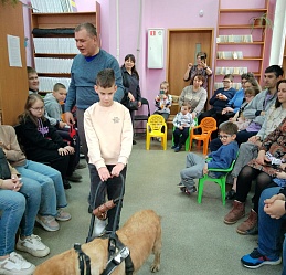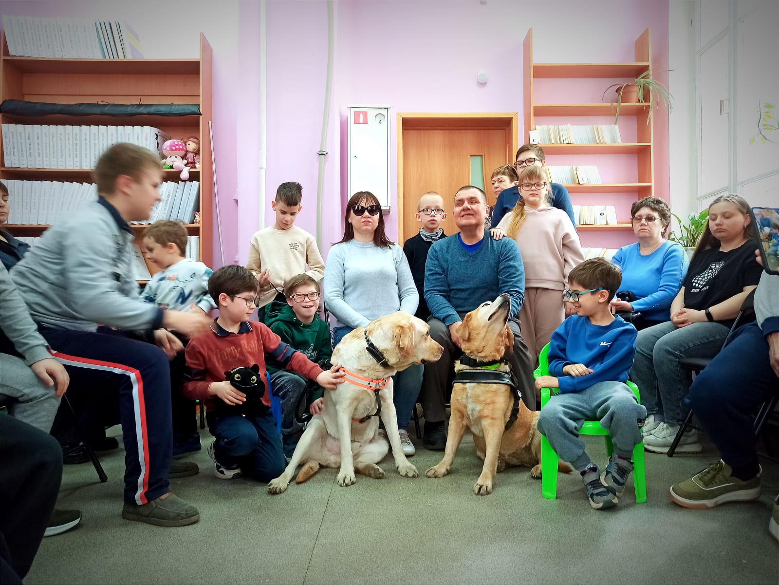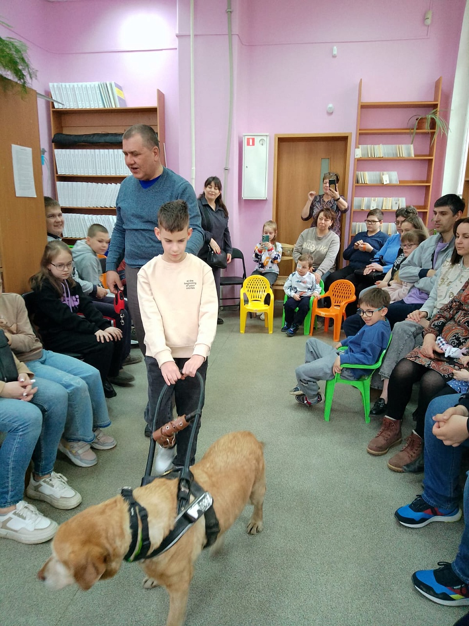 В рамках Всероссийской акции поддержки чтения «БиблиоДень-2025: И даже во тьме найду свет» 26 апреля состоялась тематическая встреча «Свои герои- военная и мирная служба четвероногих друзей человека». Участниками встречи стали дети-инвалиды по зрению, члены семейного клуба «Родительский лицей» и их родители; посетители отделения реабилитации и абилитации детей-инвалидов Центра социальной помощи семье и детям «На Московской». В гости пришли незрячие владельцы собак-проводников Светлана Каретина (руководитель клуба «Вектор»), Дмитрий Зарипов и кинолог Елена Никитина со своими четвероногими друзьями.