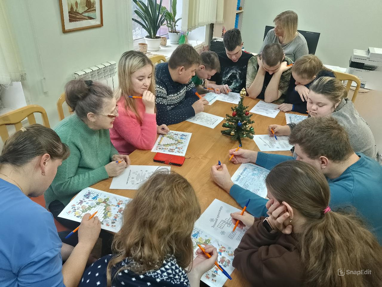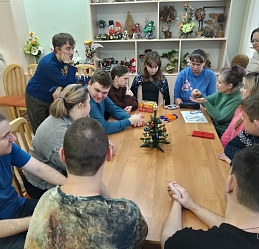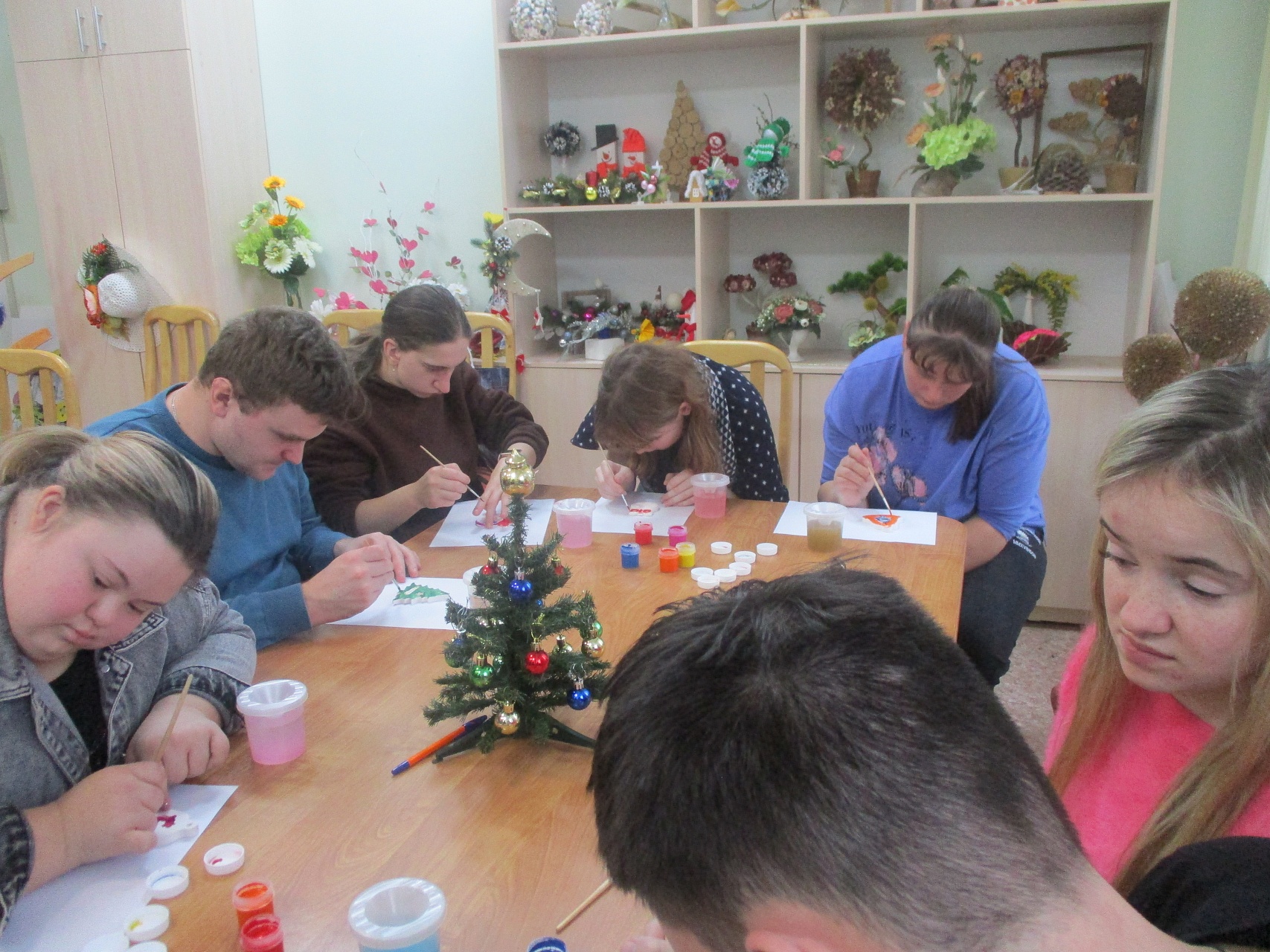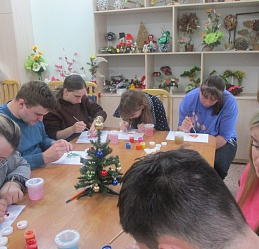 В отделении социальной реабилитации молодых инвалидов Центра социальной помощи семье и детям «На Московской» 17 декабря было проведено адаптированное выездное занятие Арт-мастерской «Синяя птица» в рамках социально-значимого проекта «Учимся видеть и творить прекрасное». Все участники занятия поприветствовали друг друга звоном колокольчика, символа благополучия и начала общей встречи; ответили на вопросы новогодней весёлой викторины; успешно справились с различными новогодними кроссвордами и с удовольствием приступили к росписи новогодних игрушек и ёлочек, проявляя творческую фантазию при выборе цветовой гаммы. Успевали при этом побеседовать и о соотношении выбранных красок с различными продуктами питания – фруктами и овощами. Несомненно, что творческий процесс рисования благотворно сказывается на улучшении психоэмоционального состояния, моторики, координации движений рук; облегчает процесс общения для людей с различными нарушениями развития.