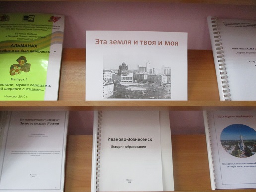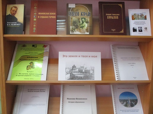 На книжной выставке «Это земля и твоя, и моя», посвящённой родному Ивановскому краю, представлена часть книжных изданий краеведческого фонда об истории, географическом положении, городах и районах Ивановской области. Читатели могут найти сведения также об ивановских меценатах. Среди экспонатов выставки - книги ивановских писателей и поэтов Контсантина Бальмонта, Владимира Догадаева, Владимира Жукова, Анны Барковой.