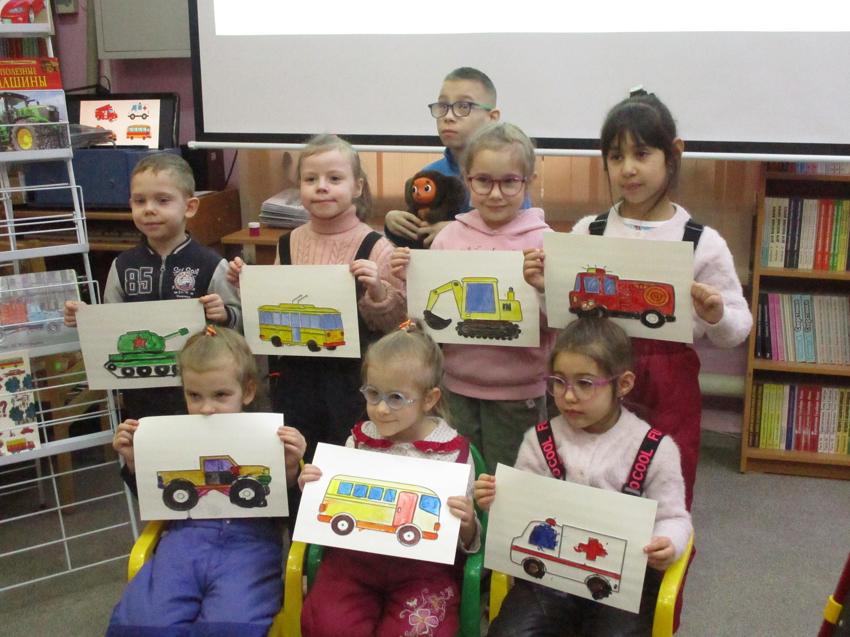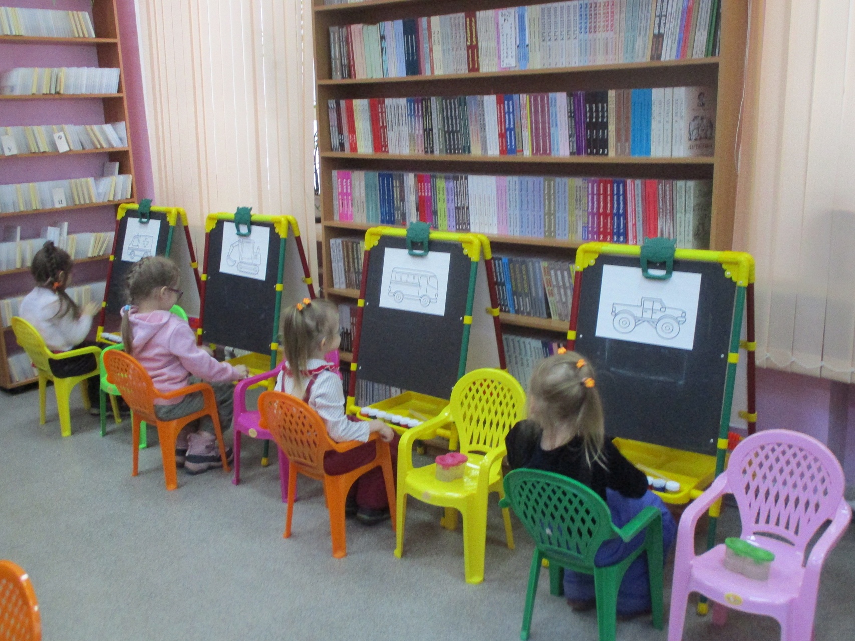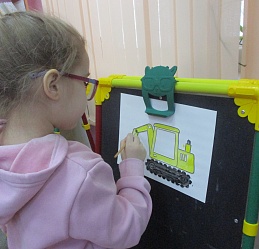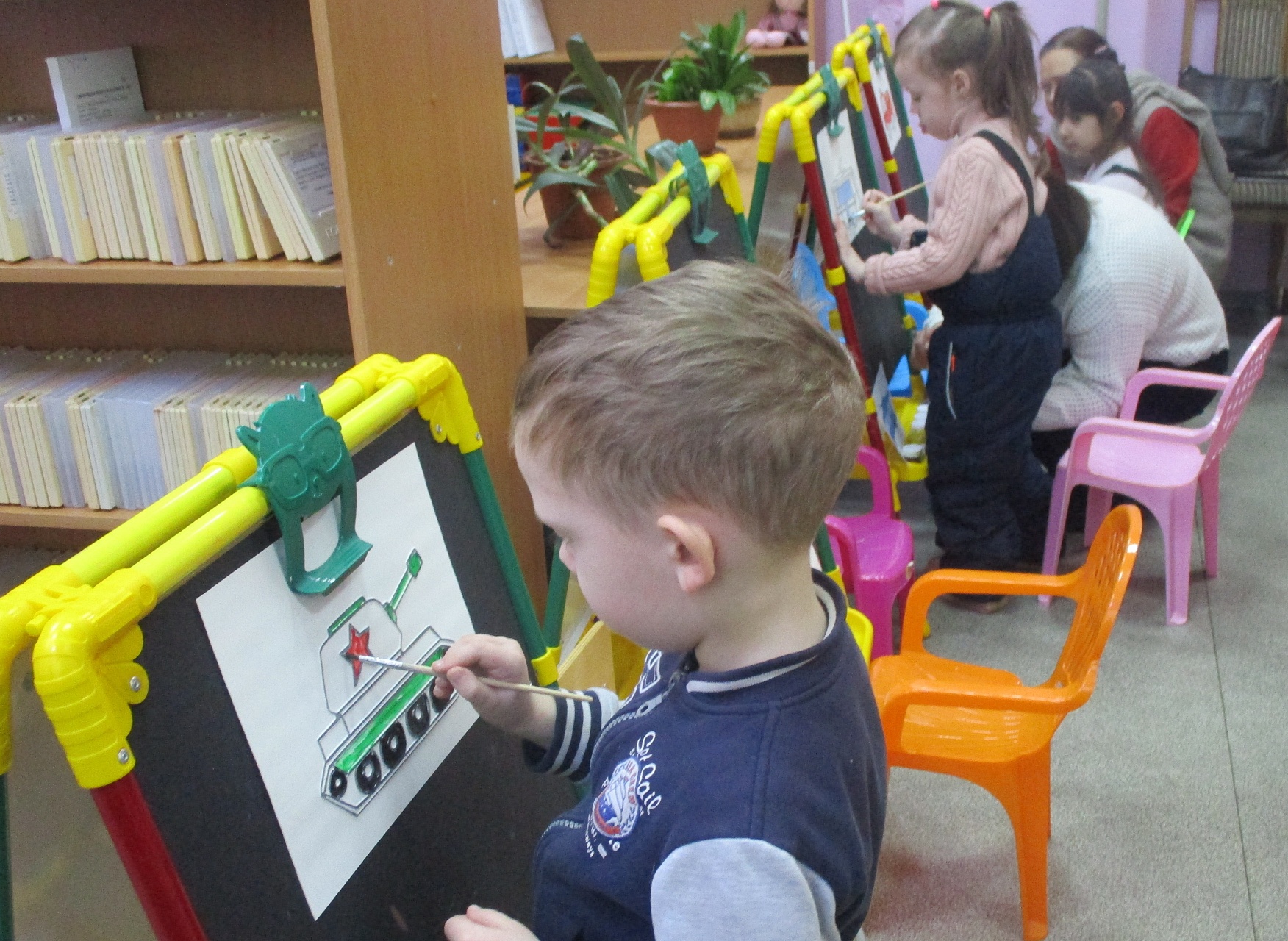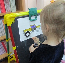 Разместившись за мольбертами, юные художники старательно трудились над раскраской контурных рельефных изображений машин-помощников человека.