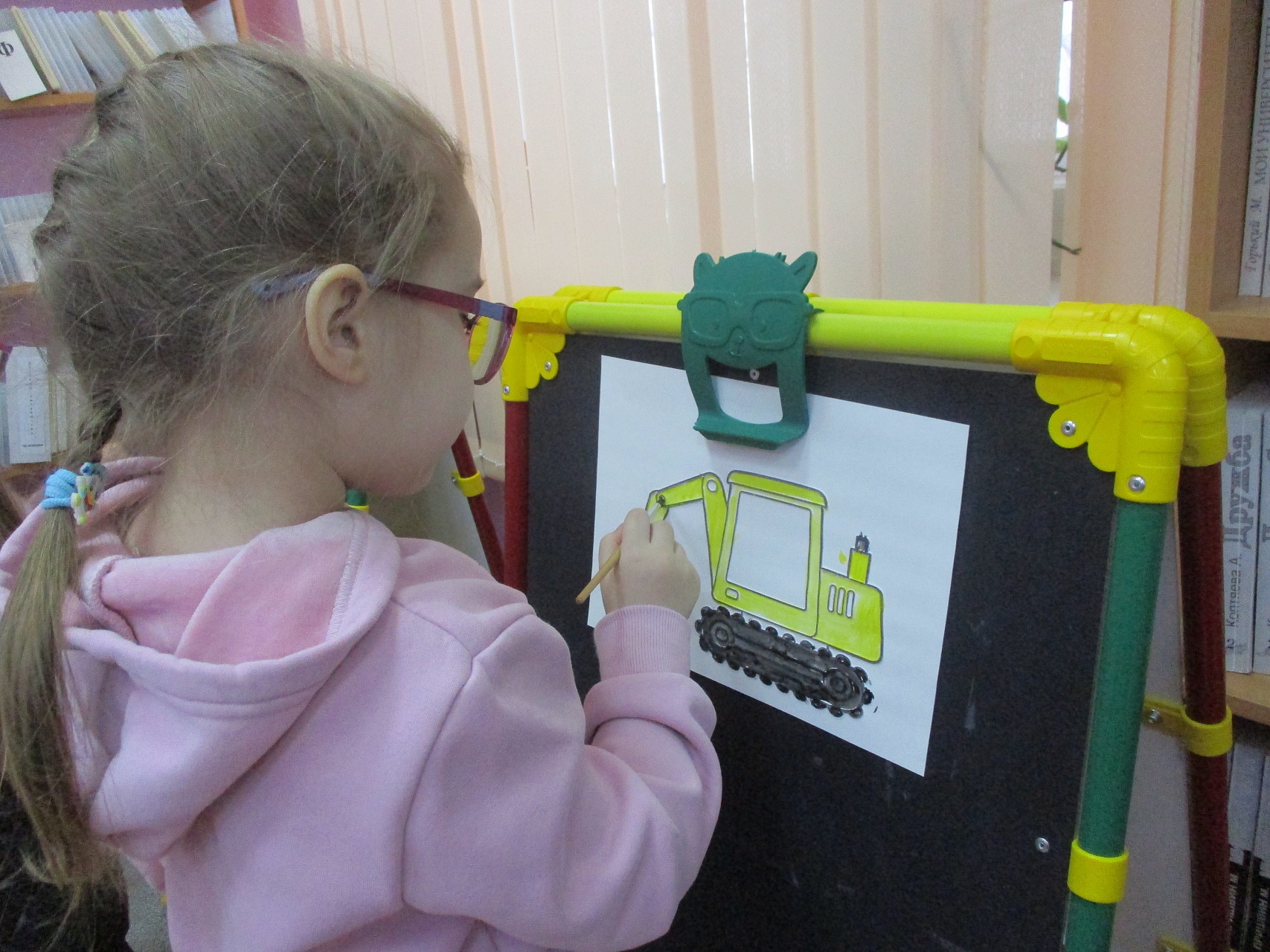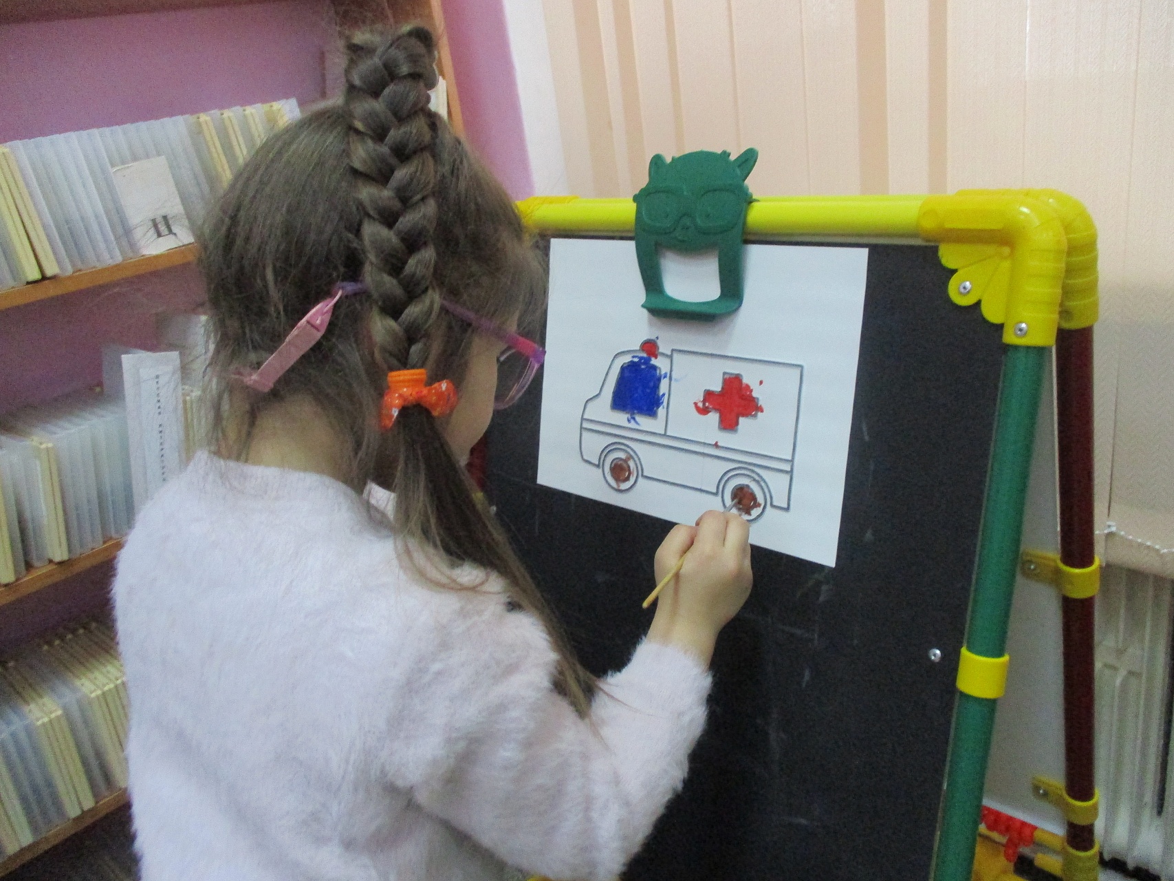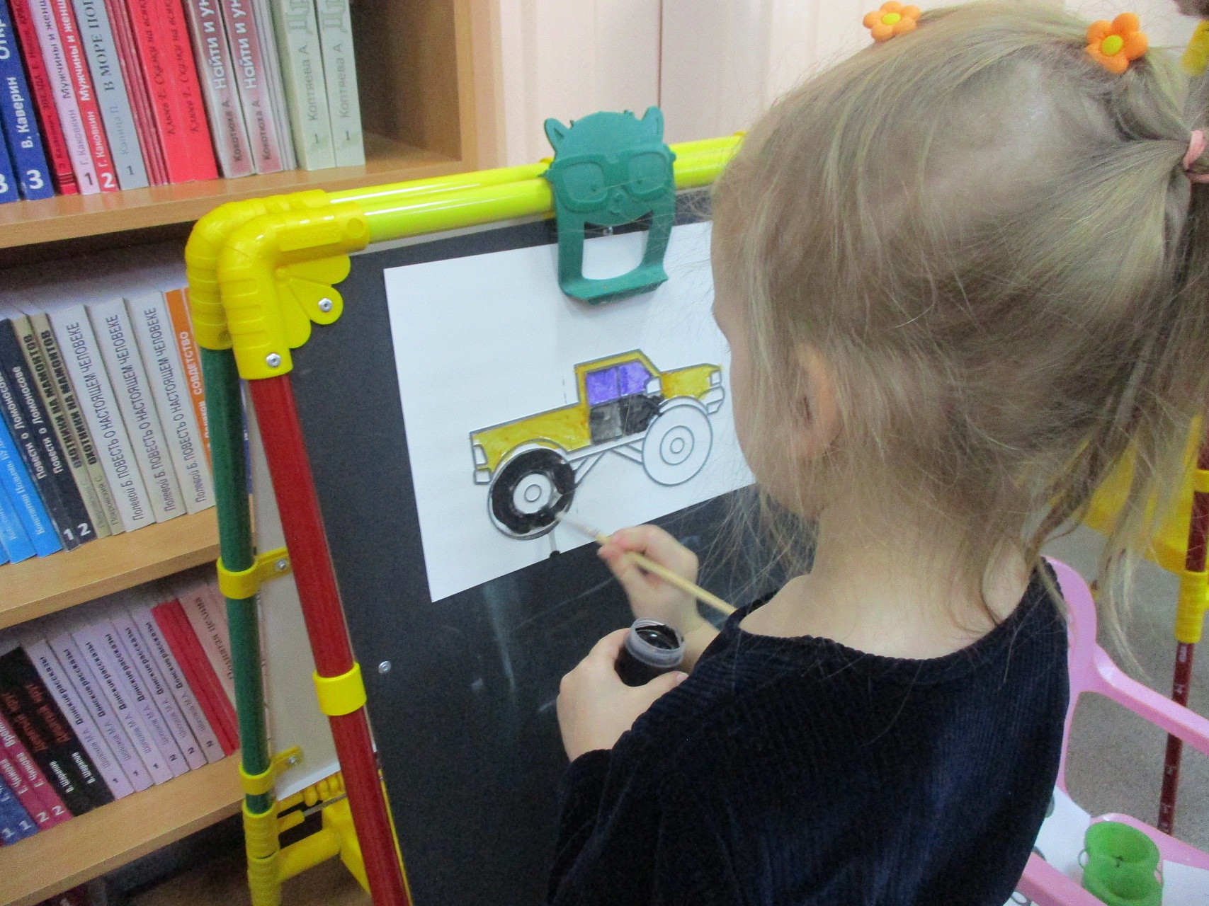 Разместившись за мольбертами, юные художники старательно трудились над раскраской контурных рельефных изображений машин-помощников человека.
