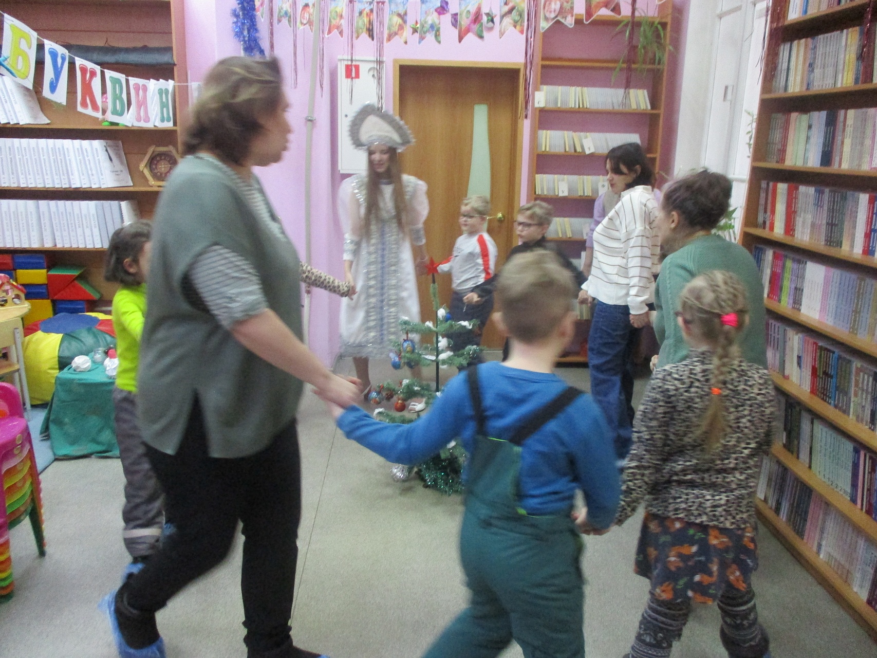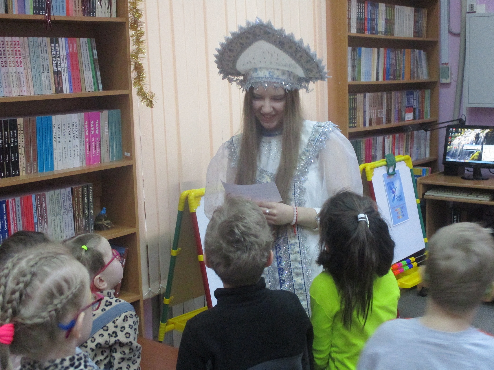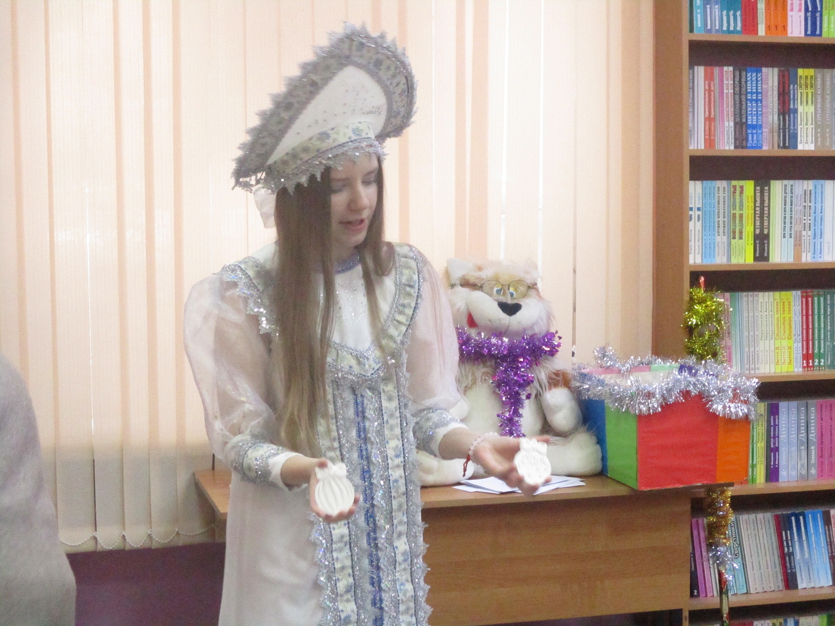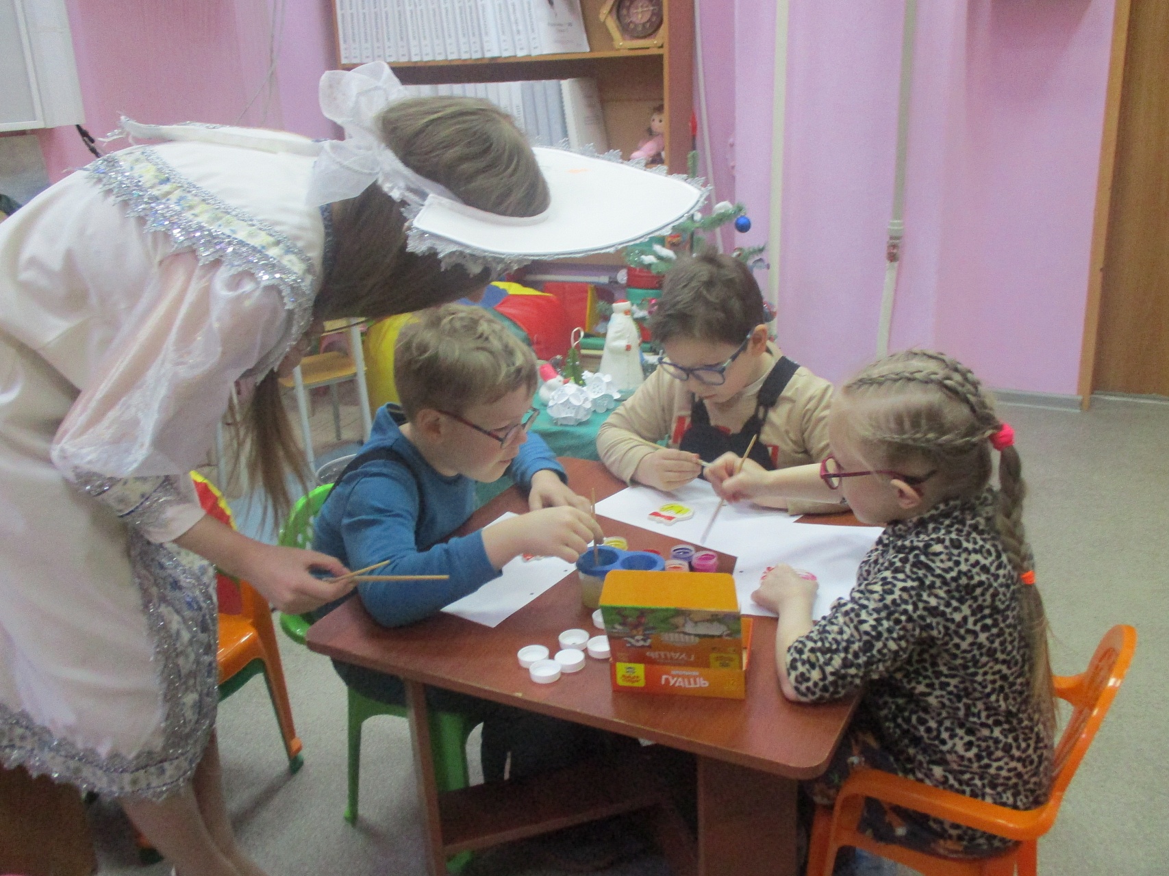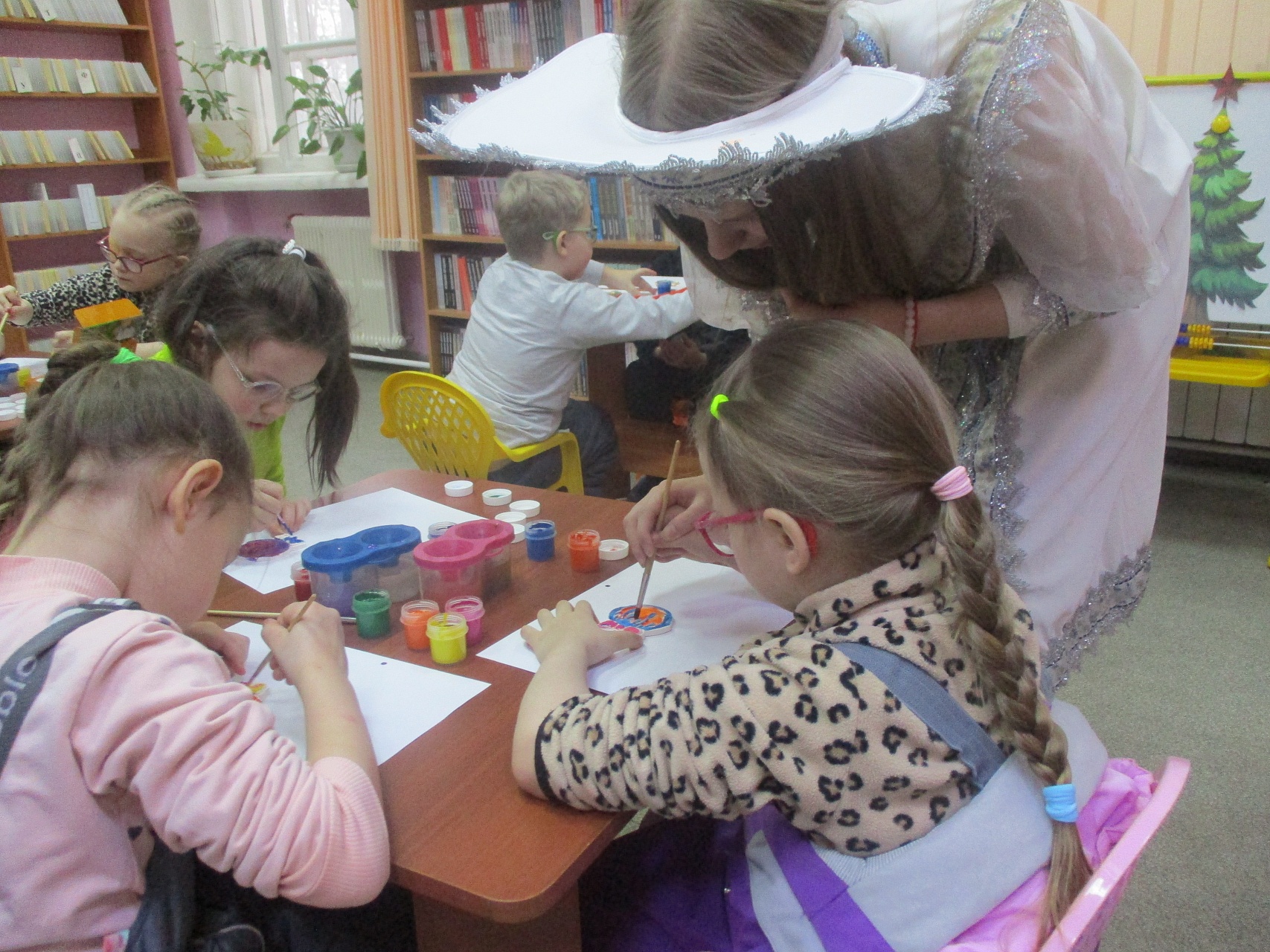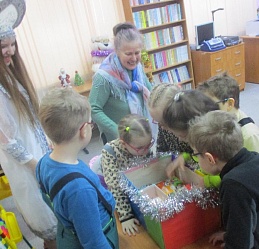 Очередной мастер-класс по росписи новогодних игрушек состоялся 16 декабря на занятии в Арт-мастерской «Синяя птица» с участием воспитанников подготовительной группы детского сада компенсирующего вида № 57. Гостей встретил ученый кот Мурлыка с известием о том, что Дед Мороз, побывавший в библиотеке накануне, решил устроить для них испытание, спрятав кисточки и краски. Поиски юных художников вместе со Снегурочкой увенчались успехом: все конверты с загадками обнаружены, и главное – праздничная коробка со всем необходимым для рисования, в процессе которого будущие новогодние игрушки на гипсовых заготовках с рельефным изображением ёлочных шаров засверкали разнообразием цветочной палитры. Ученики-дошколята при необходимой помощи Снегурочки, с ролью которой прекрасно справилась художник, педагог дополнительного образования Полина Коптелова, работали талантливо и старательно. Занятие продолжилось выполнением командных заданий: украшением новогодней зелёной красавицы яркими шарами-магнитами и игрой в снежки. Встреча в Арт-мастерской завершилась хороводом под традиционную песню про ёлочку, которая «нарядная на праздник к нам пришла».