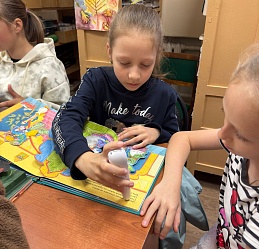 Из рассказа библиотекаря дети узнали о различных специальных форматах книжных изданий для инвалидов по зрению. Ребят заинтересовали рукодельные тактильные книги для незрячих детей, им понравилась работа с «волшебным карандашом» (серия книг Благотворительного фонда «Иллюстрированные книжки для маленьких слепых детей»).