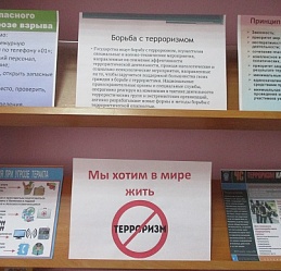В поддержку этого дня библиотекой подготовлена и оформлена информационная выставка «Мы хотим в мире жить». На выставке представлена информация укрупнённым шрифтом о классификации терроризма, методах борьбы с ним, инструкции и правила безопасного поведения при угрозе террористического акта.