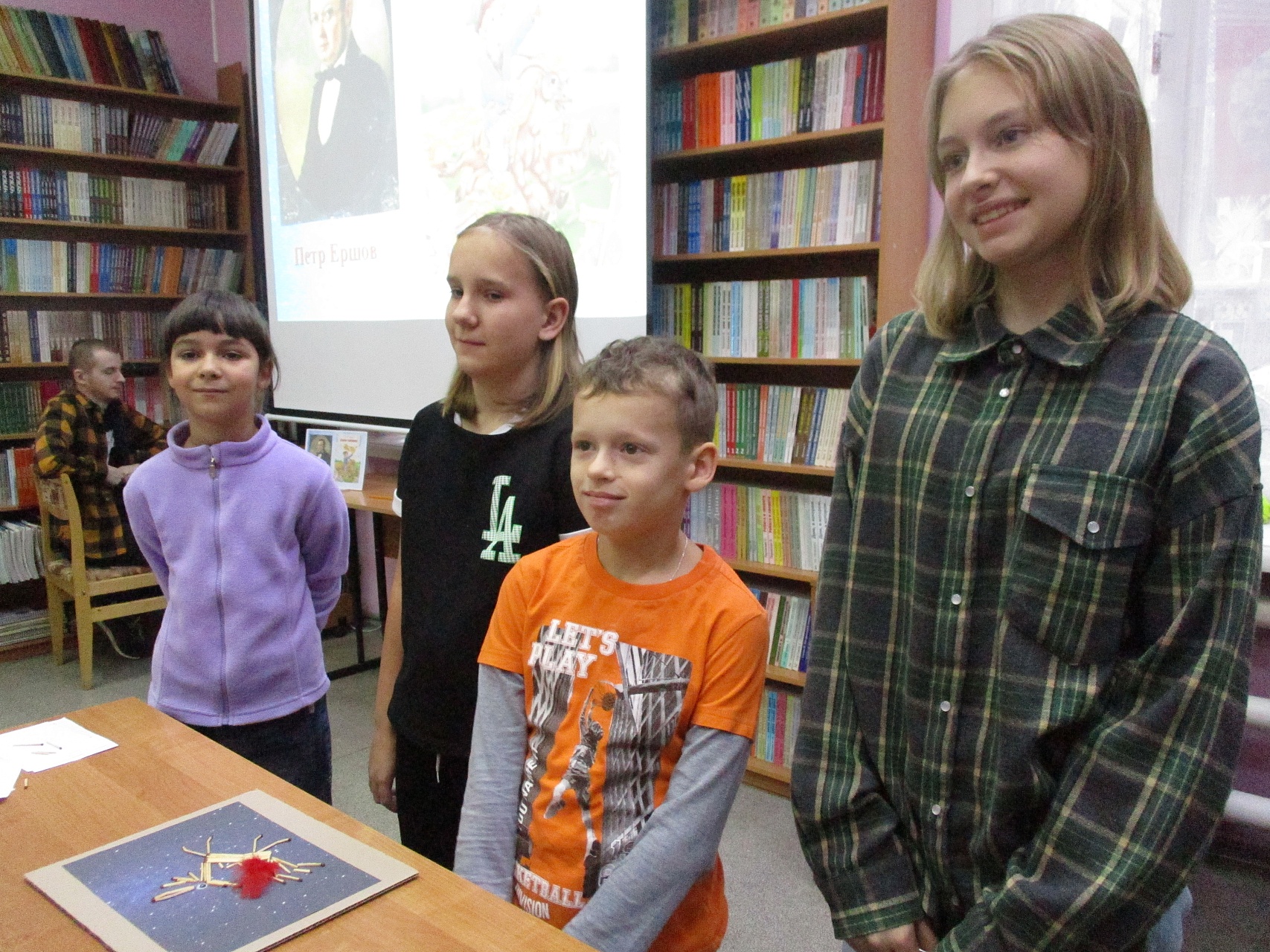 Пока дошкольники смотрели мультипликационный фильм «Теремок» по русской народной сказке, старшие ребята трудились над коллажем с изображением Конька-Горбунка из подручных материалов. Юные гости библиотеки порадовали своей внимательностью, активностью и проявленной любознательностью.