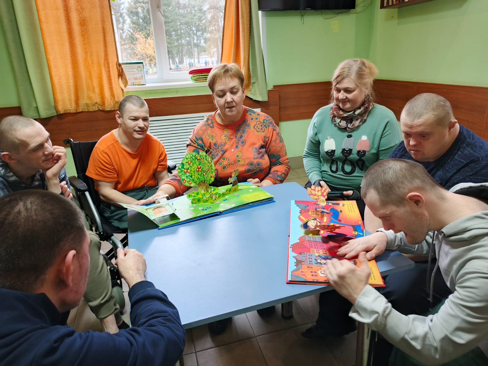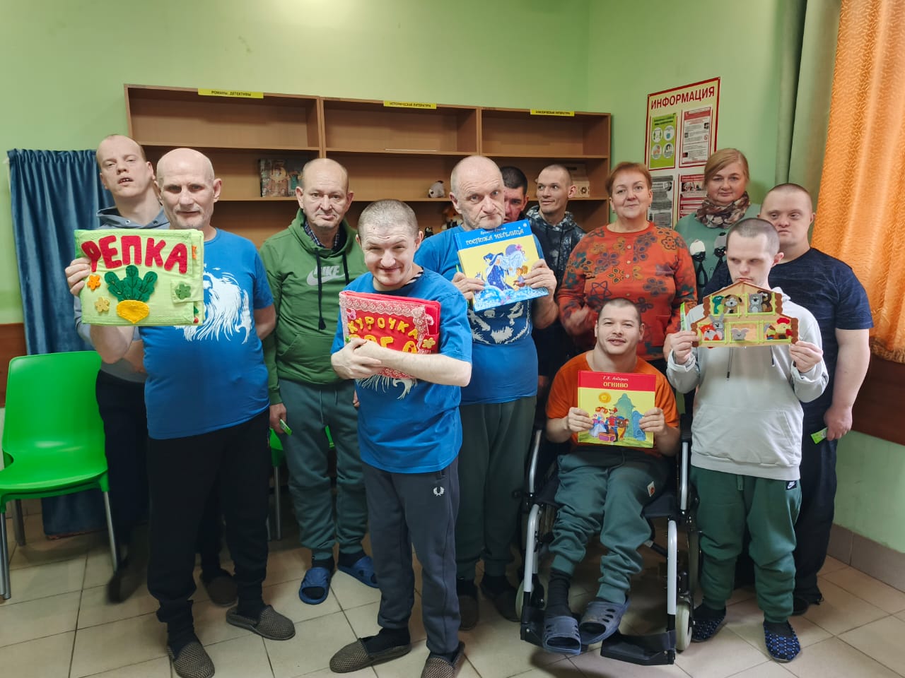 Литературная горница «Народных сказок хоровод», совместное мероприятие Кинешемского филиал № 1 Ивановской областной специальной библиотеки для слепых и Библиотеки-филиала № 2 МУ «Кинешемская городская централизованная библиотечная система», состоялась в Кинешемском доме-интернате для получателей социальных услуг отделения интенсивного ухода «Милосердие. Участники погрузились в мир сказок, активно взаимодействуя с рукотворными тактильными книгами и пальчиковым театром. Инсценировка сказок «Репка» и «Курочка Ряба» позволила почувствовать себя настоящими актерами, развить мелкую моторику и вспомнить любимые сказки. Инсценировка сказки «Теремок» с помощью пальчиковых кукол, где каждый персонаж оживал в руках, вызвал восторг у «актёров». В завершение занятия молодые люди пришли к выводу о важности дружбы и взаимопомощи, чему в немалой степени содействует народная сказка и театральное искусство.