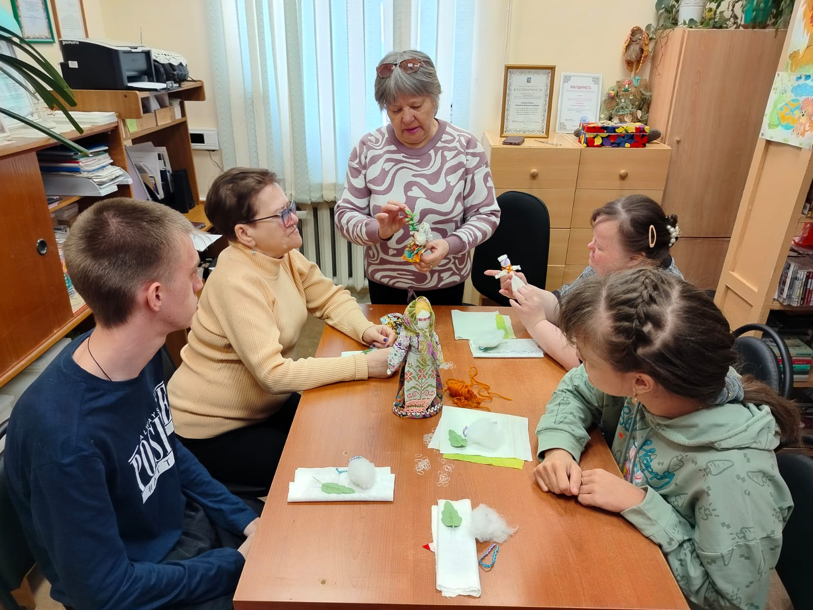 Молодые люди, посещающие отделение социальной реабилитации инвалидов Заволжского центра социального обслуживания, 9 апреля посетили Кинешемский филиал № 1, став участниками мастер-класса по изготовлению народной куклы «Пасхальная голубка».