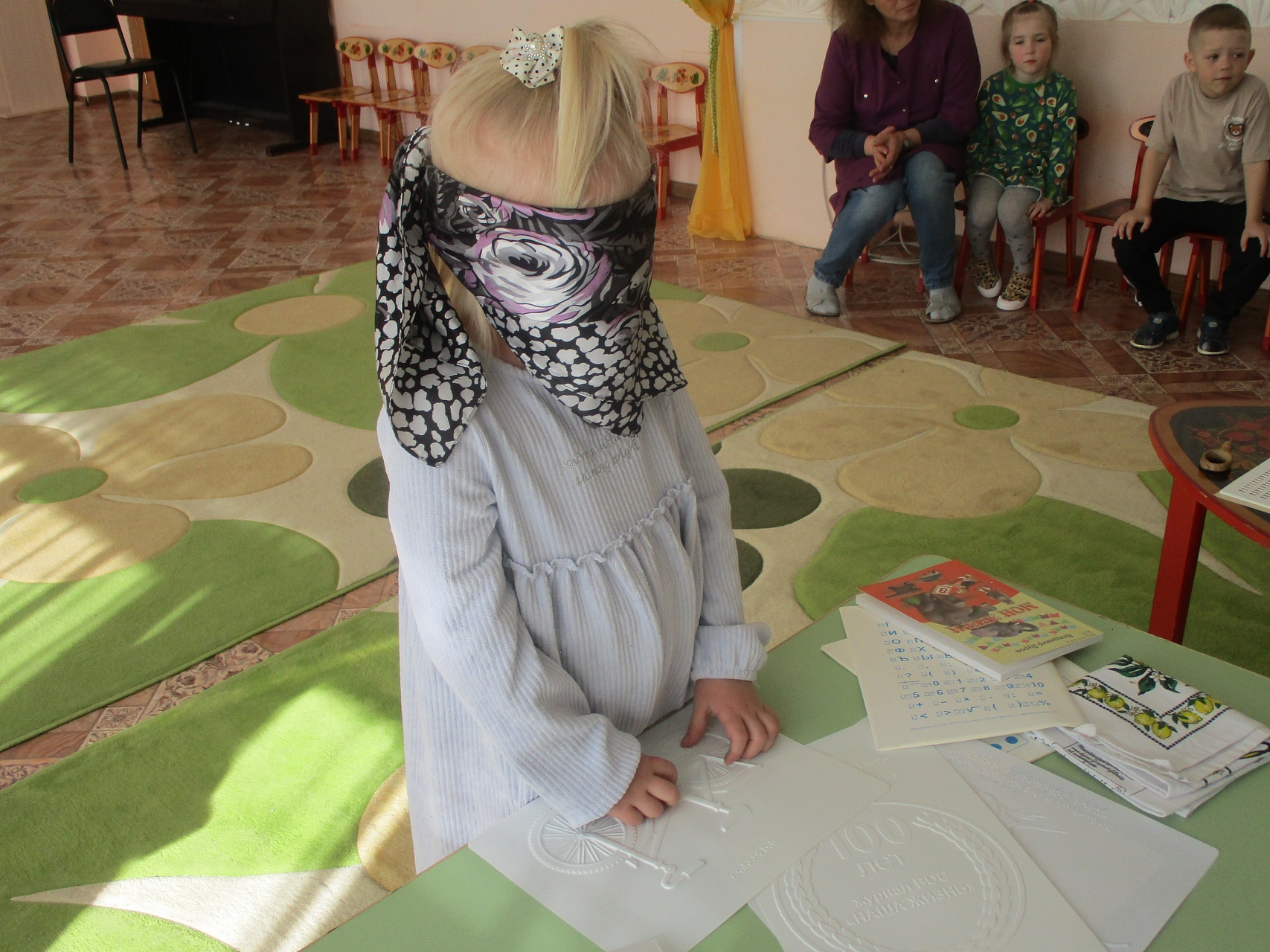 Воспитанники старшей группы детского сада №14 «Колокольчик» совершили познавательное и увлекательное путешествие в мир книг для людей с нарушениями зрения. Татьяна Виноградова, ведущий библиотекарь Шуйского филиала № 2, рассказала о разнообразных специальных изданиях для юных и взрослых читателей библиотеки, некоторые книги были продемонстрированы. Дети ознакомились с биографией французского тифлопедагога Луи Брайля, создателя системы грамотности для незрячих. Особый интерес у детей вызвали рукодельные тактильные книги, помогающие их незрячим сверстникам познавать окружающий мир; также специальный прибор для письма и тетради. Ребята попробовали самостоятельно с помощью грифеля написать на приборе некоторые буквы. Очень интересен детям стал и «говорящий» градусник: всем была измерена температура. Кроме того, ребята с удовольствием приняли участие в играх «Поводырь», «Найди друга», «Угадай, что это?», которые позволили им, в том числе, узнать о том, как ориентируются в пространстве незрячие люди (дети прошли по залу с закрытыми глазами с белой тростью). В течение всего занятия дошкольники были активны и теперь они имеют представление о помощниках незрячих детей и взрослых. Ребята приняли самое активное участие в мероприятии, позволившее им узнать о различных помощниках, делающих жизнь незрячего человеке полноценной и комфортной.