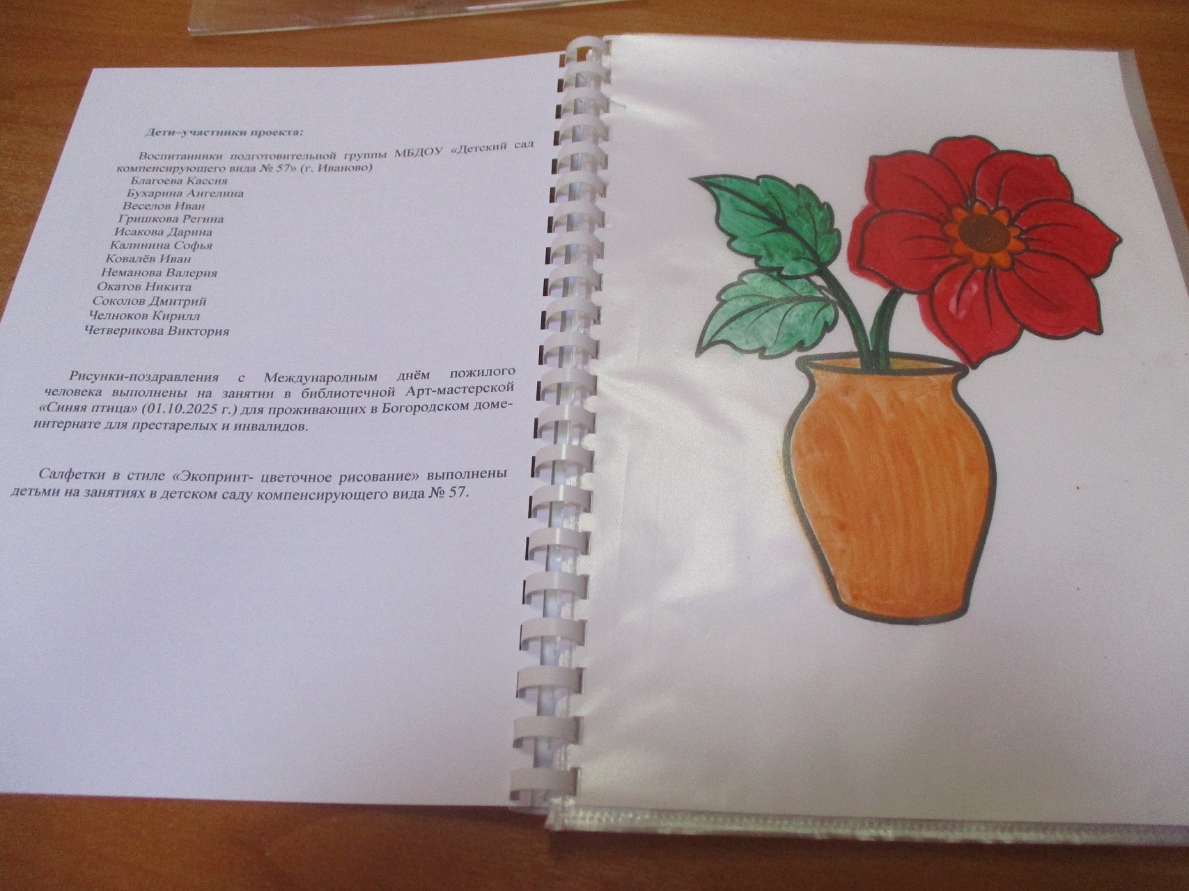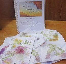 По завершении ретро-вечера библиотекой был подарен альбом «Мир детства откроет дверцу на радость взрослому сердцу» с рисунками, выполненными воспитанниками детского сада компенсирующего вида № 57 на занятии в Арт-мастерской «Синяя птица», в рамках Международного дня пожилого человека. Также подарком стали салфетки, оформленные ребятами в детском саду в стиле «Экопринт- цветочное рисование».