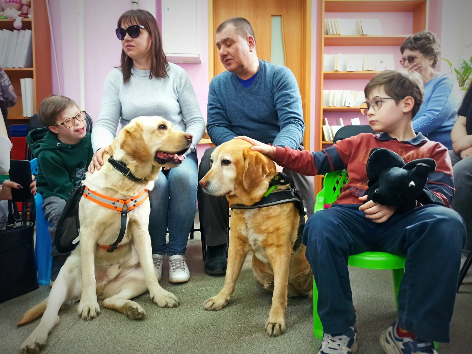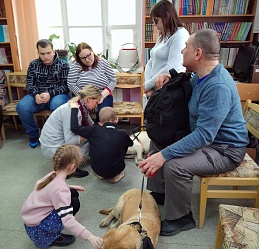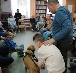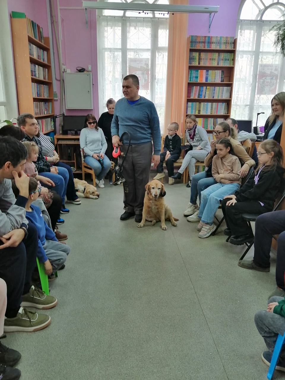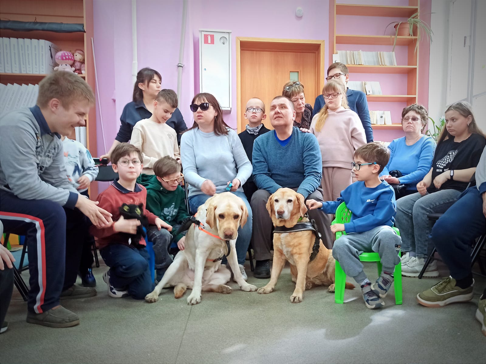 В рамках Всероссийской акции поддержки чтения «БиблиоДень-2025: И даже во тьме найду свет» 26 апреля состоялась тематическая встреча «Свои герои- военная и мирная служба четвероногих друзей человека». Участниками встречи стали дети-инвалиды по зрению, члены семейного клуба «Родительский лицей» и их родители; посетители отделения реабилитации и абилитации детей-инвалидов Центра социальной помощи семье и детям «На Московской». В гости пришли незрячие владельцы собак-проводников Светлана Каретина (руководитель клуба «Вектор»), Дмитрий Зарипов и кинолог Елена Никитина со своими четвероногими друзьями.