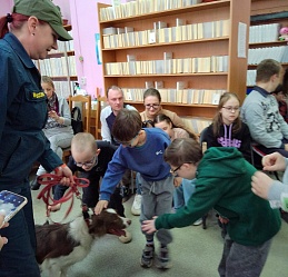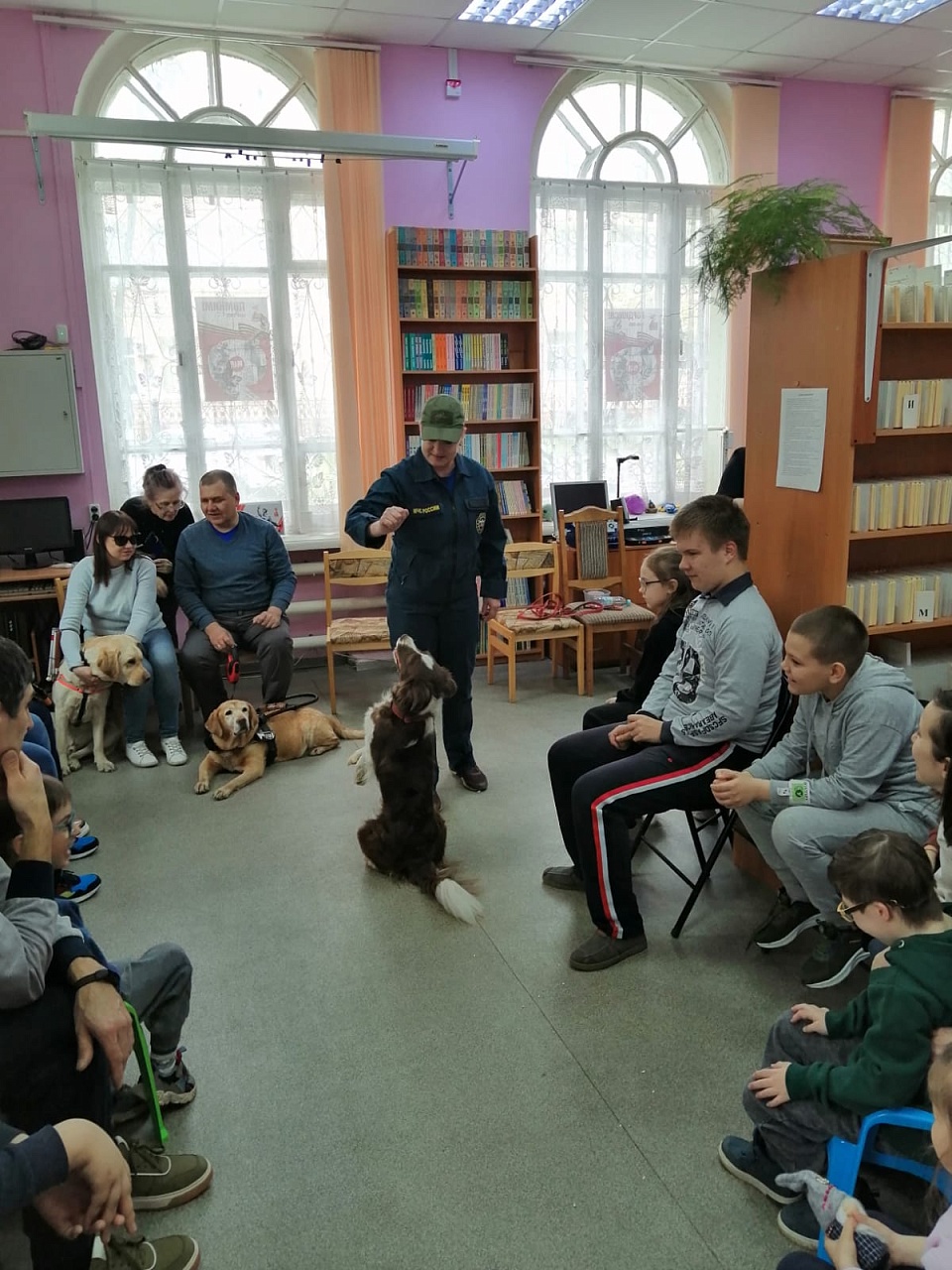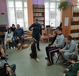Встреча началась с беседы-общения о военных профессиях собак в годы Великой Отечественной войны, об уникальной собаке-минёре Джульбарсе, награжденной медалью «За боевые заслуги». Четвероногие верные друзья человека продолжают нести службу и в мирное время, как бордер-колли Наоми с кинологом ГУ МЧС России Еленой Никитиной.