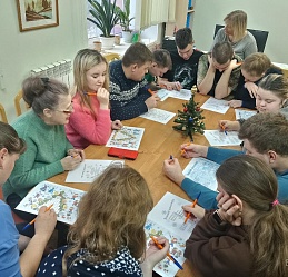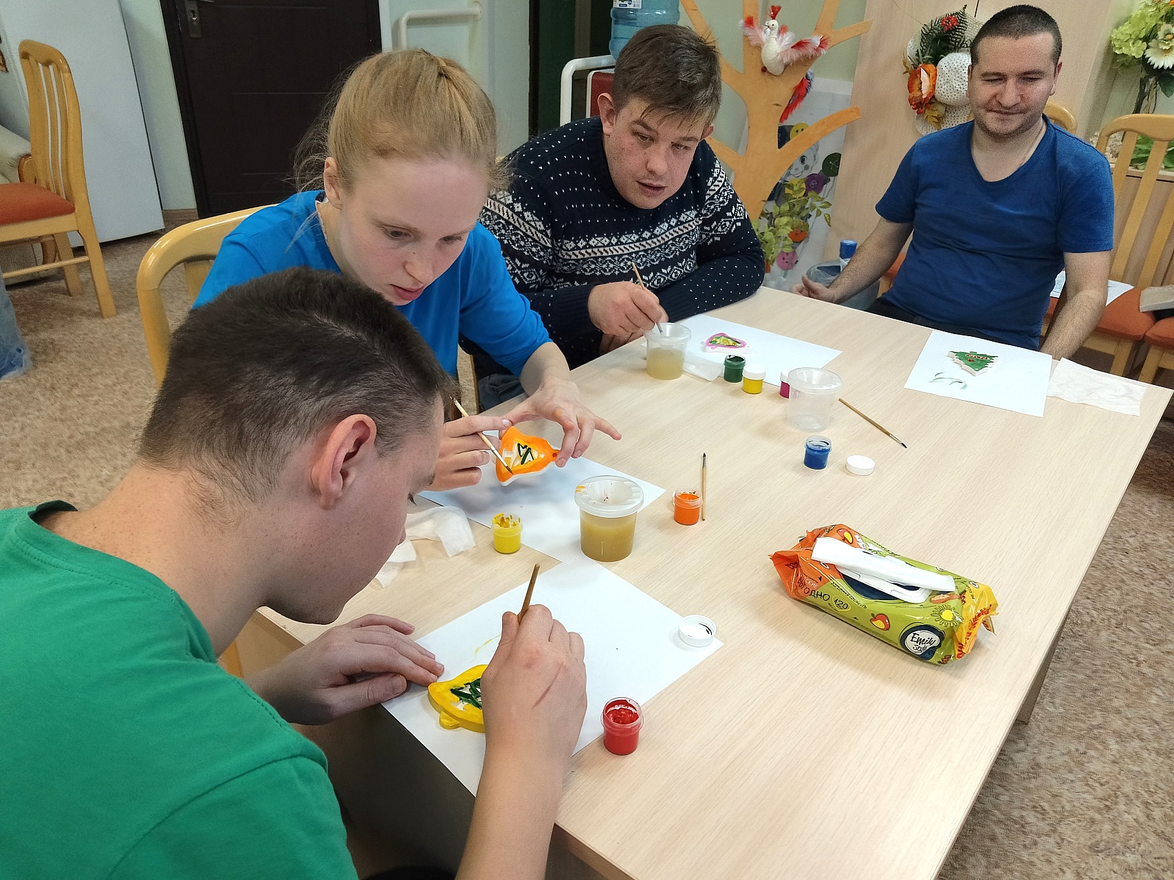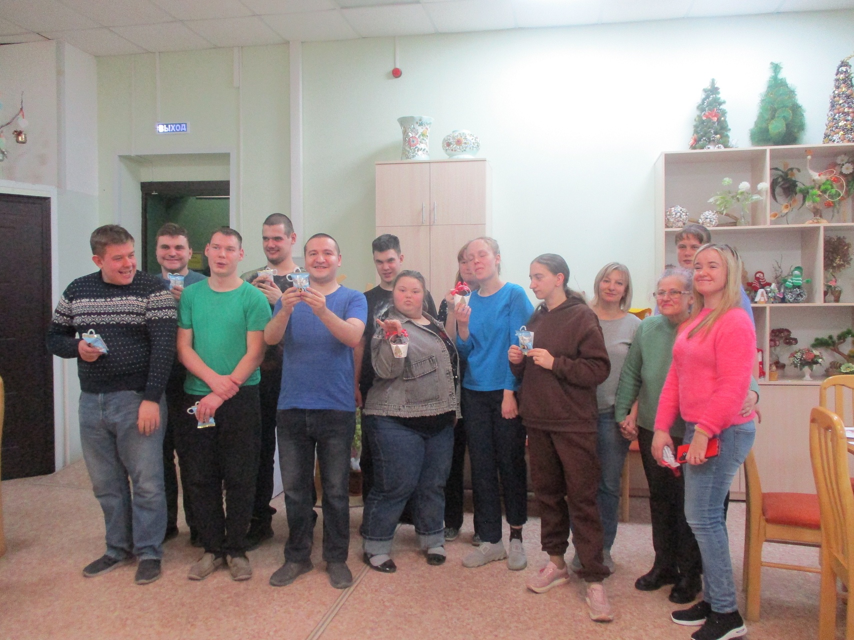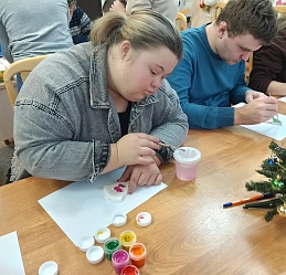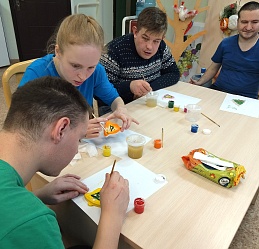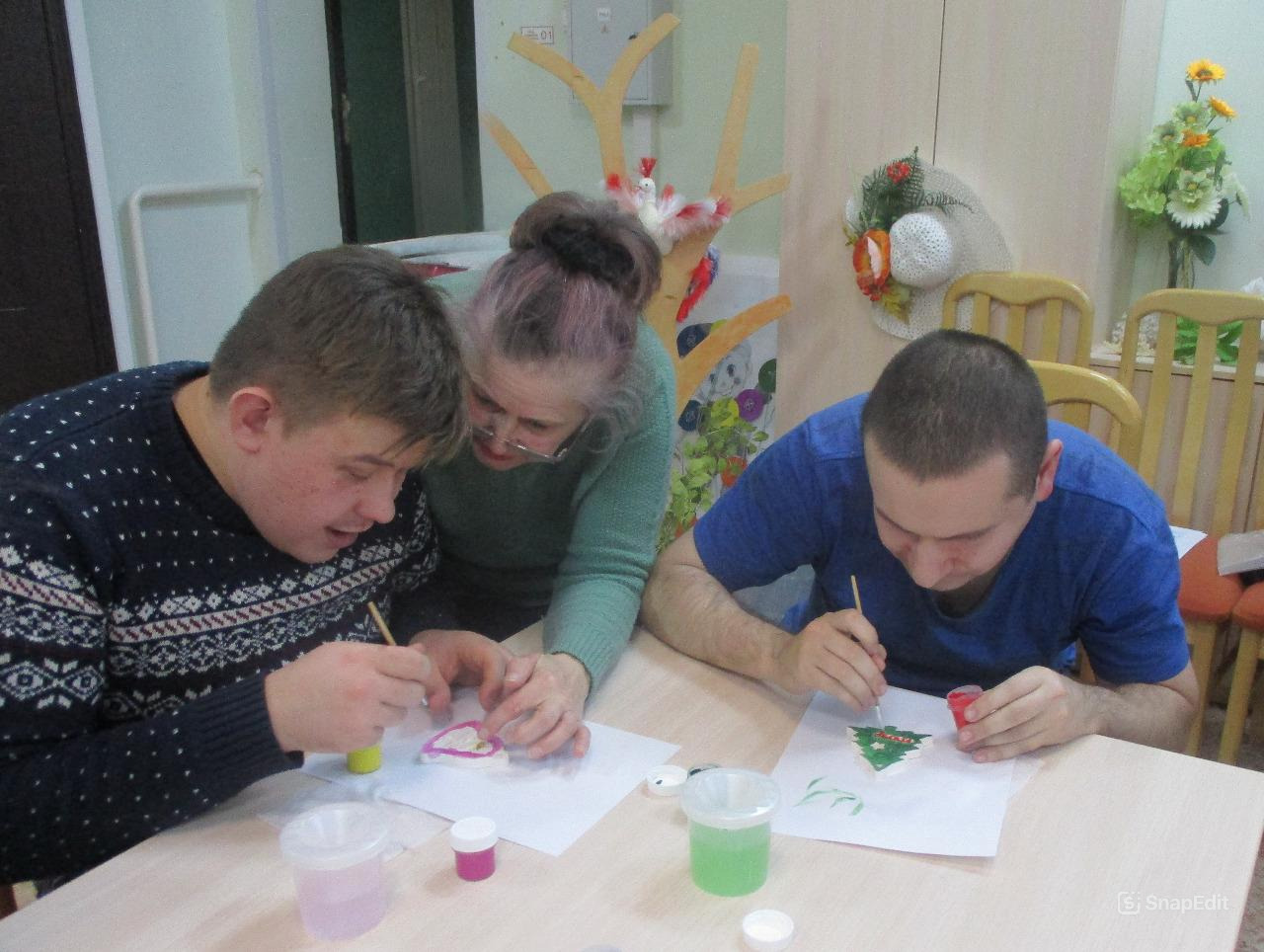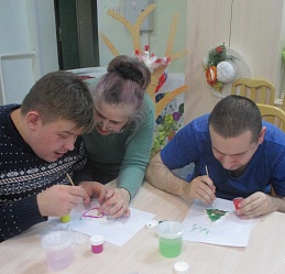 В отделении социальной реабилитации молодых инвалидов Центра социальной помощи семье и детям «На Московской» 17 декабря было проведено адаптированное выездное занятие Арт-мастерской «Синяя птица» в рамках социально-значимого проекта «Учимся видеть и творить прекрасное». Все участники занятия поприветствовали друг друга звоном колокольчика, символа благополучия и начала общей встречи; ответили на вопросы новогодней весёлой викторины; успешно справились с различными новогодними кроссвордами и с удовольствием приступили к росписи новогодних игрушек и ёлочек, проявляя творческую фантазию при выборе цветовой гаммы. Успевали при этом побеседовать и о соотношении выбранных красок с различными продуктами питания – фруктами и овощами. Несомненно, что творческий процесс рисования благотворно сказывается на улучшении психоэмоционального состояния, моторики, координации движений рук; облегчает процесс общения для людей с различными нарушениями развития.