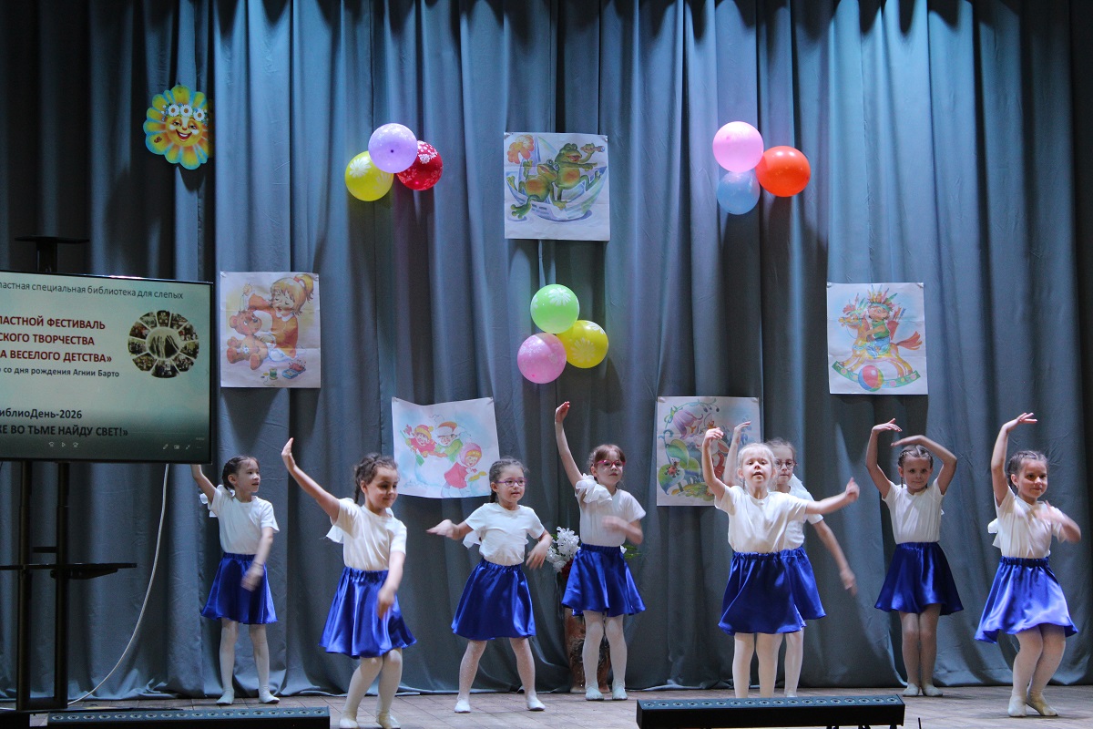 В рамках Всероссийской акции поддержки чтения «БиблиоДень-2026: И даже во тьме найду свет…» 17 апреля в актовом зале Дома культуры Ивановской областной организации ВОС состоялся детский праздник по итогам VIII областного фестиваля детского творчества «Страна весёлого детства», посвященный 125-летнему юбилею детской писательницы А. Л. Барто
